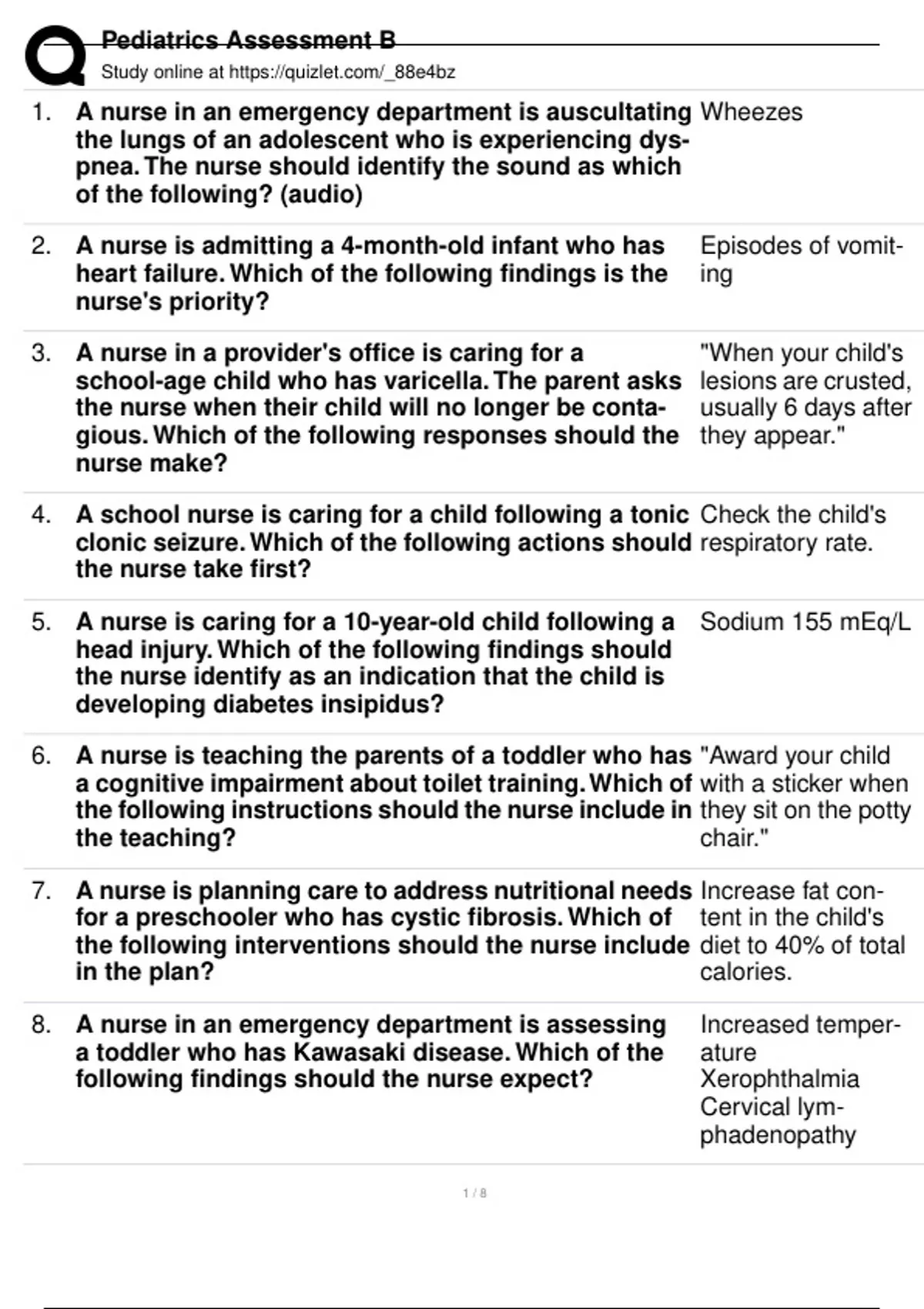 Pediatrics Assessment B 1. A nurse in an emergency department is auscultating the lungs of an adolescent who is experiencing dys- pnea. The nurse should identify the sound as which of the following? (audio) Wheezes 2. A nurse is admitting a 4-month-old infant who has heart failure. Which of the following findings is the nurse's priority? Episodes of vomit- ing 3. A nurse in a provider's office is caring for a school-age child who has varicella. The parent asks the nurse when their child will no longer be conta- gious. Which of the following responses should the nurse make? "When your child's lesions