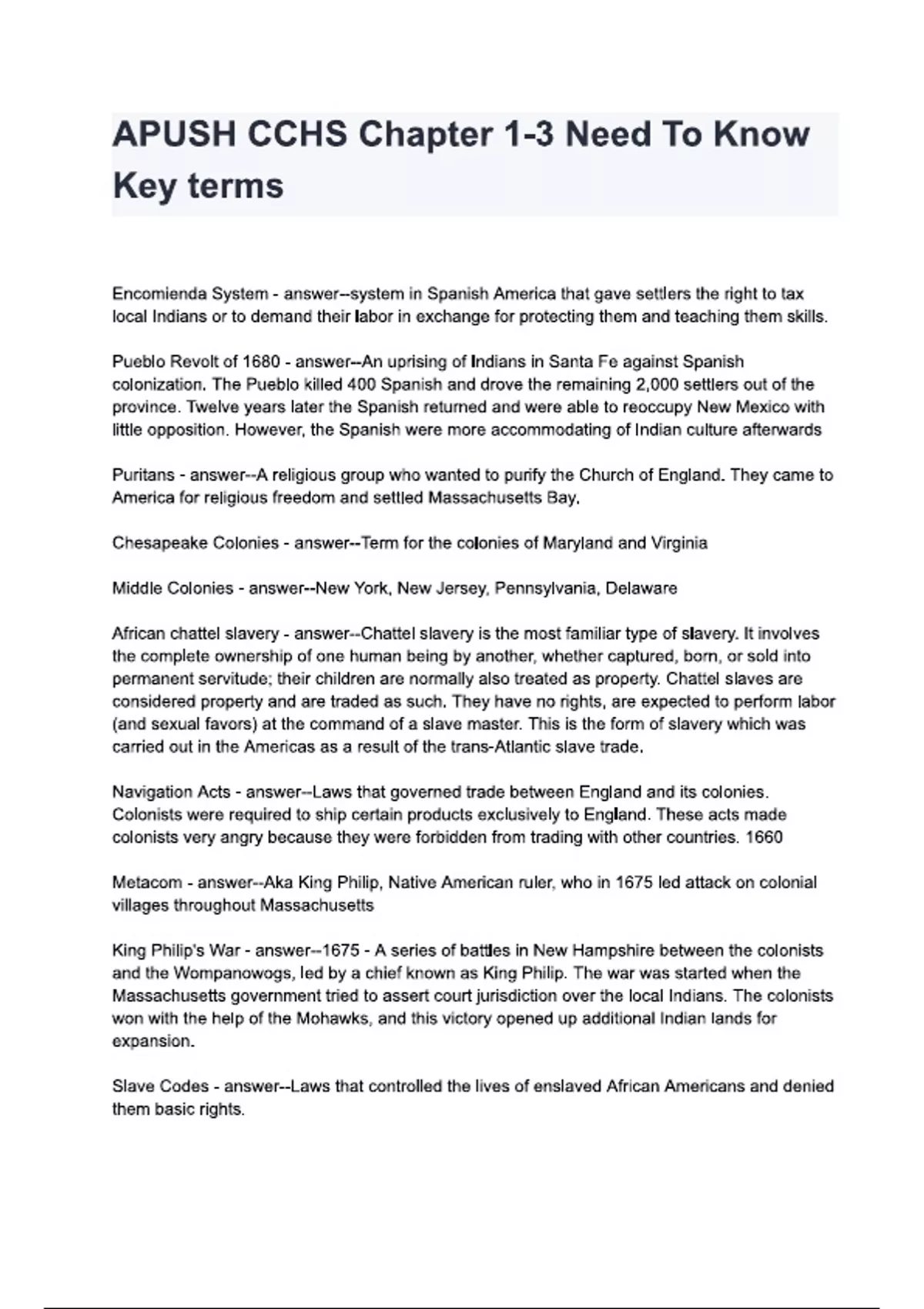 APUSH CCHS Chapter 1-3 Need To Know Key terms questions and answers