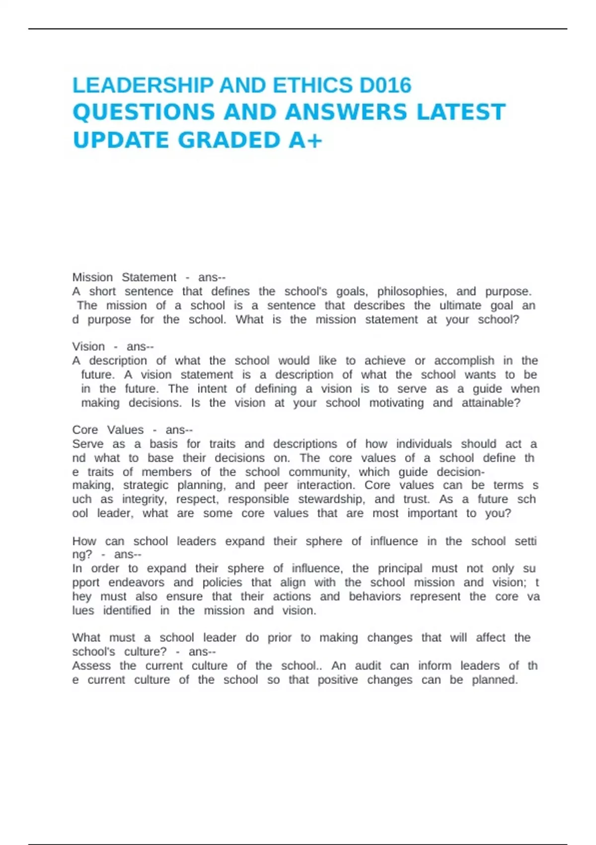 LEADERSHIP AND ETHICS D016 QUESTIONS AND ANSWERS LATEST UPDATE GRADED A.