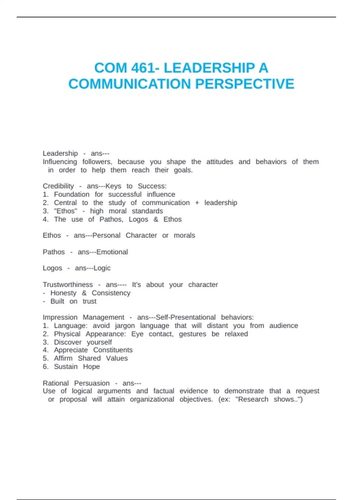 COM 461- LEADERSHIP A COMMUNICATION PERSPECTIVE