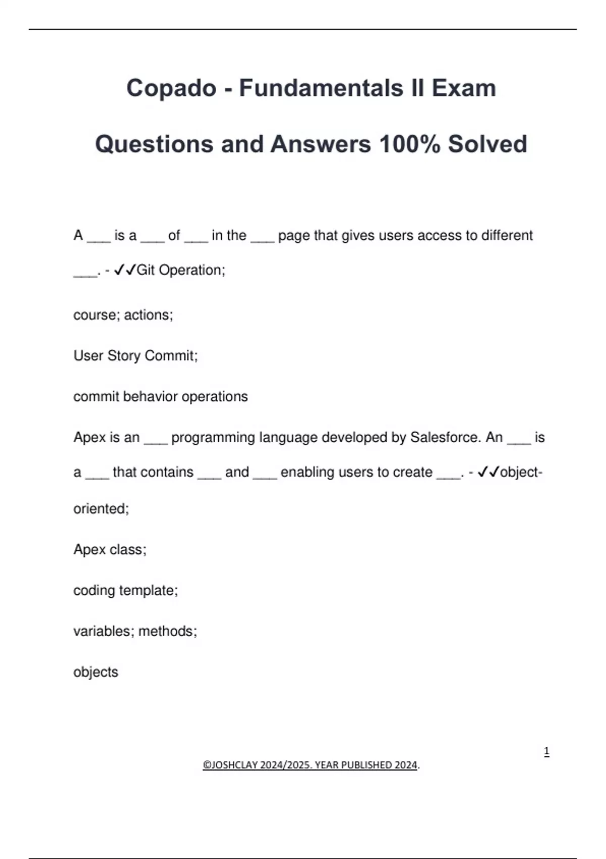 Copado - Fundamentals II Exam Questions and Answers 100% Solved A ___ is a ___ of ___ in the ___ page that gives users access to different ___. - Git Operation; course; actions; User Story Commit; commit behavior operations Apex is an ___ programming language developed by Salesforce. An ___ is a ___ that contains ___ and ___ enabling users to create ___. - objectoriented; Apex class; coding template; variables; methods; objects