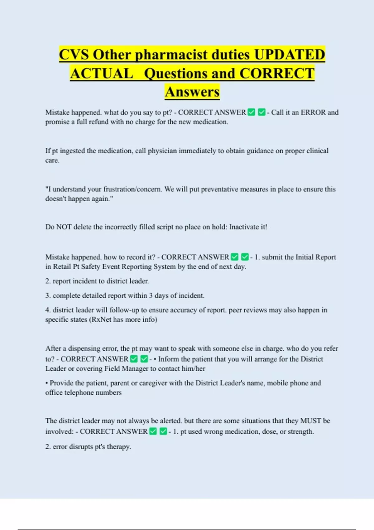 CVS Other pharmacist duties UPDATED ACTUAL Questions and CORRECT Answers Mistake happened. what do you say to pt? - CORRECT ANSWER - Call it an ERROR and promise a full refund with no charge for the new medication. If pt ingested the medication, call physician immediately to obtain guidance on proper clinical care.
