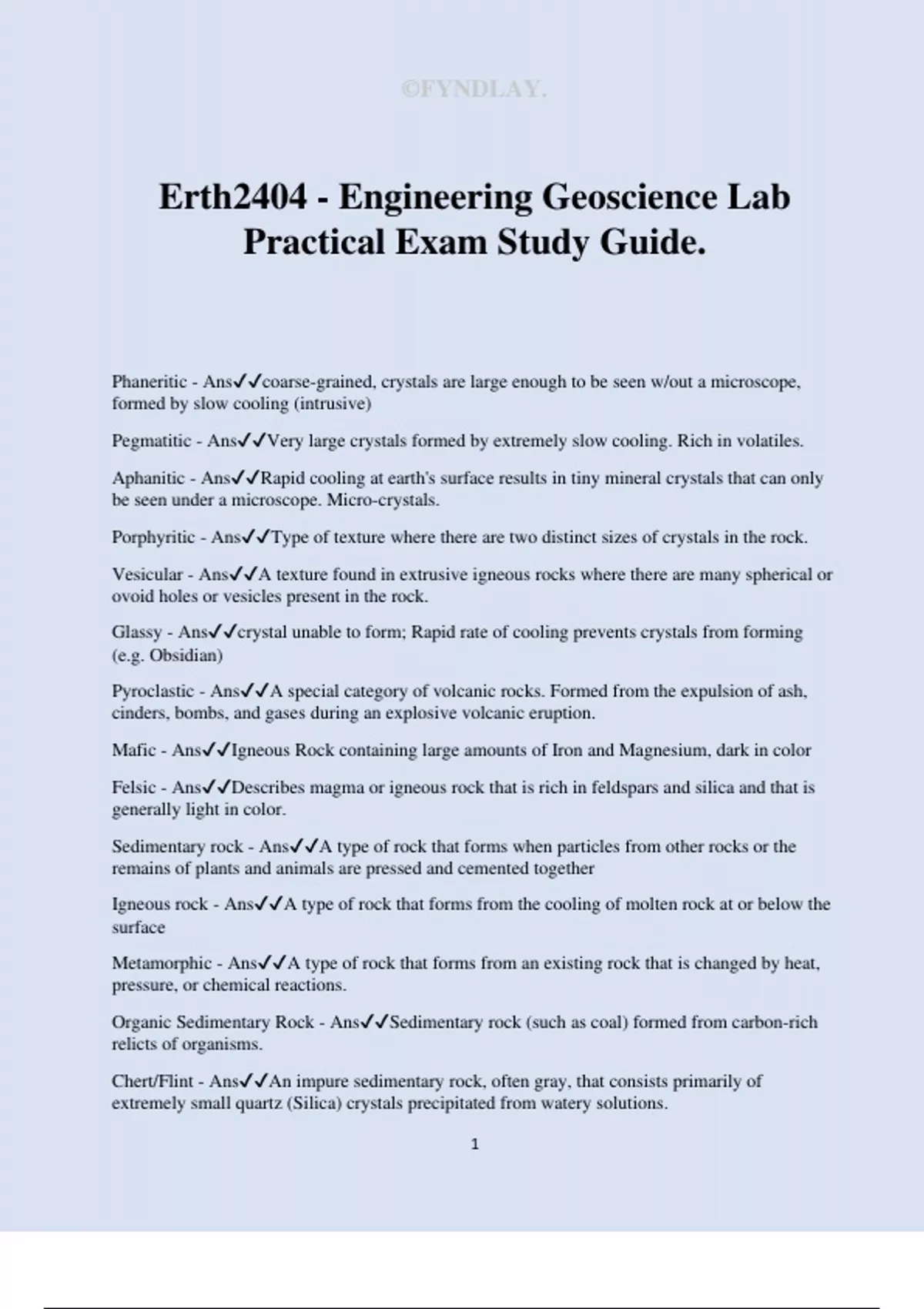 Erth2404 - Engineering Geoscience Lab Practical Exam Study Guide. Phaneritic - Anscoarse-grained, crystals are large enough to be seen w/out a microscope, formed by slow cooling (intrusive) Pegmatitic - AnsVery large crystals formed by extremely slow cooling. Rich in volatiles. Aphanitic - AnsRapid cooling at earth's surface results in tiny mineral crystals that can only be seen under a microscope. Micro-crystals. Porphyritic - AnsType of texture where there are two distinct sizes of crystals in the rock. Vesicular - AnsA texture found in extrusive igneous rocks where there are many spherical or ovoid holes or vesicles present in the rock. Glassy - Anscrystal unable to form; Rapid rate of cooling prevents crystals from forming (e.g. Obsidian) Pyroclastic - AnsA special category of volcanic rocks. Formed from the expulsion of ash, cinders, bombs, and gases during an explosive volcanic eruption. Mafic - AnsIgneous Rock containing large amounts of Iron and Magnesium, dark in color Felsic - AnsDescribes magma or igneous rock that is rich in feldspars and silica and that is generally light in color. Sedimentary rock - AnsA type of rock that forms when particles from other rocks or the remains of plants and animals are pressed and cemented together Igneous rock - AnsA type of rock that forms from the cooling of molten rock at or below the surface Metamorphic - AnsA type of rock that forms from an existing rock that is changed by heat, pressure, or chemical reactions. Organic Sedimentary Rock - AnsSedimentary rock (such as coal) formed from carbon-rich relicts of organisms. Chert/Flint - AnsAn impure sedimentary rock, often gray, that consists primarily of extremely small quartz (Silica) crystals precipitated from watery solutions. ©FYNDLAY. 2 Carbonate - AnsIs a common mineral that occurs as the major constituent of limestone or as the cementing material in clastic rocks. (Calcite CaCO3) a weak reaction will occur if you scratch the rock and apply HCl. Clastic - AnsA sedimentary rock composed of weathered fragments of older rock. Evaporites - Anssedimentary rocks formed from minerals left after water evaporates Lithic Fragments - AnsSedimentary rocks that contain fragments of rocks and/or minerals as coarse clastic material (gravel or sand-sized particles e.g. Conglomerates) Feldspar - AnsIn some circumstances, sedimentary rocks may often contain significant amounts of feldspar. Feldspar often break down into clay minerals during weathering. (e.g. plagioclase and orthoclase) Aluminous - AnsProtolith is shale or mudrock, contains abundant aluminum. Quartzo-feldspathic - AnsIf the protolith is a felsic igneous rock that contains abundant feldspar and quartz. Calcerous - AnsIf the protolith is a carbonate sedimentary rock (e.g. calcite, dolostone) Slaty - AnsDescribing a rock that splits easily along nearly flat and parallel planes. Phyllitic - Ansrefers to the alignment of platy (sheet-like) minerals into a layered structure, where the minerals are too small to recognize. Biggest distinction between phyllite and schist is usually crystal size. Schistose - AnsThe texture of a rock in which visible platy or needle-shaped minerals have grown essentially parallel to each other under the influence of directed pressure. Have a shiny metallic appearance. Gniessic - AnsCoarsely foliated texture in which the minerals have been segregated into compositional layers or bands. Olivine - AnsGreen color Non-metallic lustre - vitreous 6.5-7 hardness (harder than the plate) Streak is colourless Cleavage: indistinct Fracture: semi-conchoidal, uneven Pyroxene - AnsBlack color Non-metallic lustre