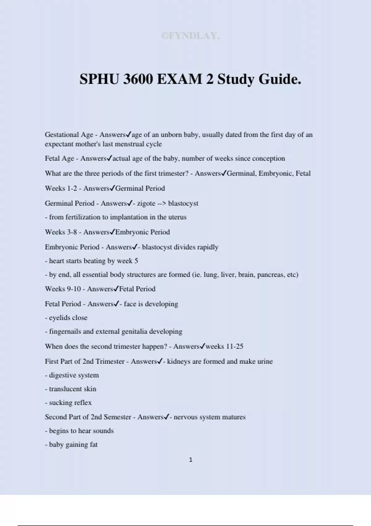 SPHU 3600 EXAM 2 Study Guide. Gestational Age - Answersage of an unborn baby, usually dated from the first day of an expectant mother's last menstrual cycle Fetal Age - Answersactual age of the baby, number of weeks since conception What are the three periods of the first trimester? - AnswersGerminal, Embryonic, Fetal Weeks 1-2 - AnswersGerminal Period Germinal Period - Answers- zigote -- blastocyst - from fertilization to implantation in the uterus Weeks 3-8 - AnswersEmbryonic Period Embryonic Period - Answers- blastocyst divides rapidly - heart starts beating by week 5 - by end, all essential body structures are formed (ie. lung, liver, brain, pancreas, etc) Weeks 9-10 - AnswersFetal Period Fetal Period - Answers- face is developing - eyelids close - fingernails and external genitalia developing When does the second trimester happen? - Answersweeks 11-25 First Part of 2nd Trimester - Answers- kidneys are formed and make urine - digestive system - translucent skin - sucking reflex Second Part of 2nd Semester - Answers- nervous system matures - begins to hear sounds - baby gaining fat ©FYNDLAY. 2 - external genitalia are visible, 2nd trimester ultrasound When is the third trimester? - Answers26-38 weeks 3rd Trimester: 26-31 weeks - Answers- bones hardening (except skull) - breating - kicking starts - eyes open 3rd Trimester: 32-36 weeks - Answers- body fat increases - skin becomes pink and smooth - CNS developed, baby can survive outside the womb - starts positioning in head-down position 3rd Trimester: 37-38 weeks - Answers- fat being added on body - final lung development - full term at 38 weeks Fetal Breathing - Answerspractice diaphragm movements Fetal Swallowing - Answersregulate amount of amniotic fluid Thumb-sucking - Answersnecessary for post-natal feeding and self soothing Startle/Moro Reflex - Answerssudden movement/noise causes fetus to reflexively fling out arms and legs Yawning and Hip cupping - Answerssigns of good health Fetal Development - Genetic disorders - Answers- single gene (cystic fibrosis, sickle cell, Tay- Sachs) - chromosomal - epigenetic Fetal Development - Teratogenic disorders - Answerssmoking, alcohol, medications/drugs, environmental toxins Effects of teratogens - Answerscleft lip, spina bifida, fetal alcohol syndrome Teratogen - Answersany factor that can cause a birth defect