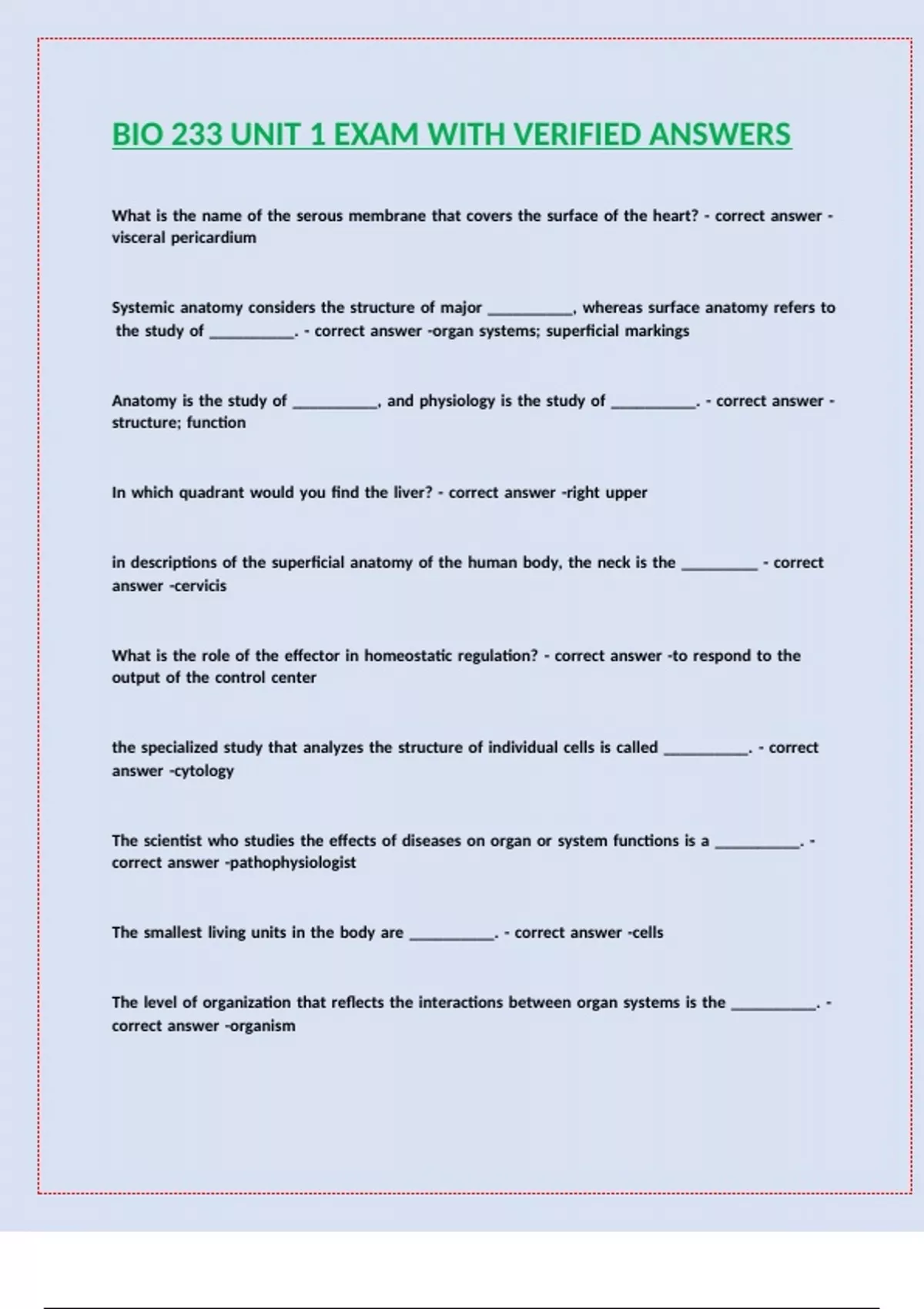 BIO 233 UNIT 1 EXAM WITH VERIFIED ANSWERS