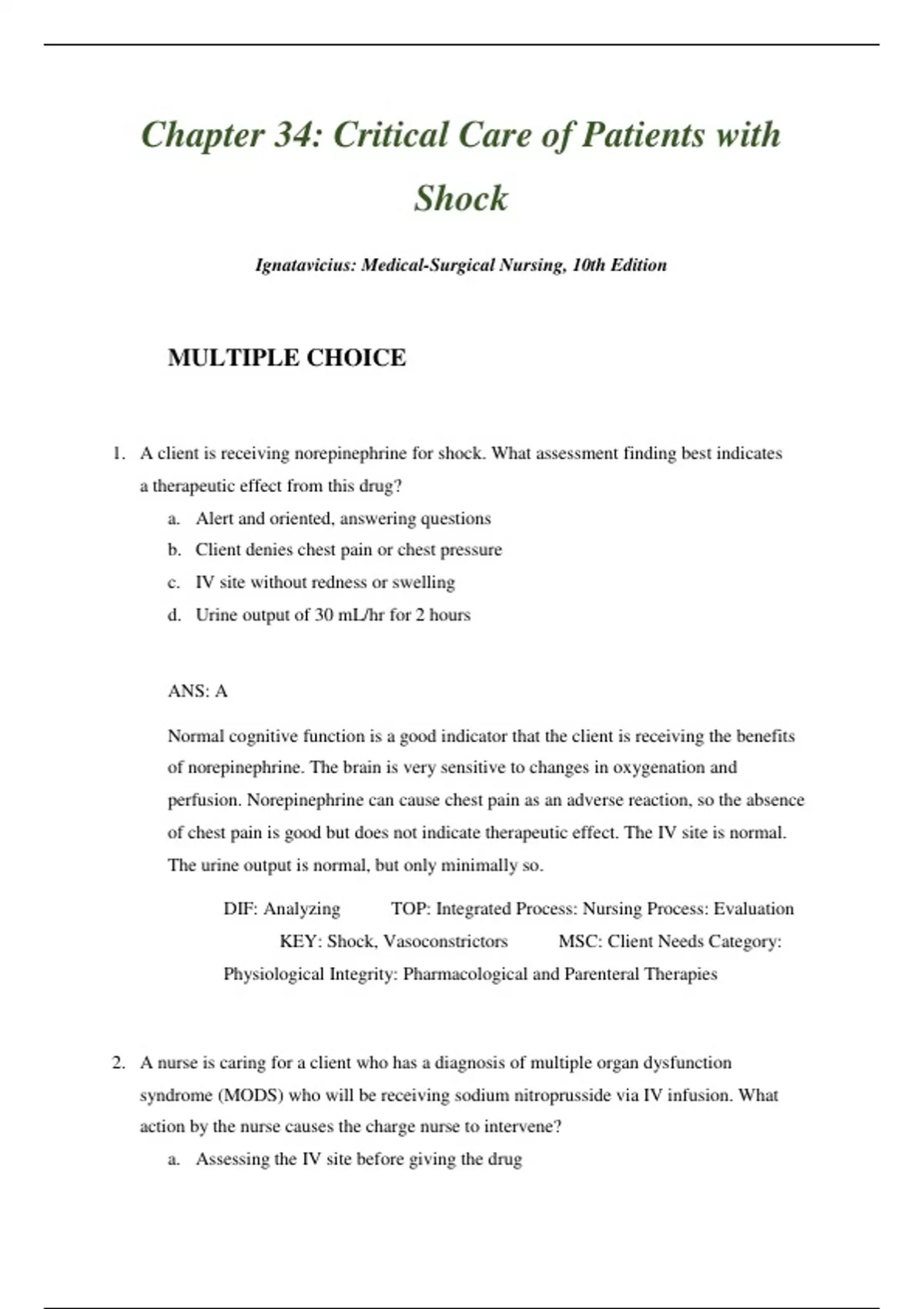 MULTIPLE CHOICE 1. A client is receiving norepinephrine for shock. What assessment finding best indicates a therapeutic effect from this drug? a. Alert and oriented, answering questions b. Client denies chest pain or chest pressure c. IV site without redness or swelling d. Urine output of 30 mL/hr for 2 hours ANS: A Normal cognitive function is a good indicator that the client is receiving the benefits of norepinephrine. The brain is very sensitive to changes in oxygenation and perfusion. Norepinephrine can cause chest pain as an adverse reaction, so the absence of chest pain is good but does not indicate therapeutic effect. The IV site is normal. The urine output is normal, but only minimally so. DIF: Analyzing TOP: Integrated Process: Nursing Process: Evaluation KEY: Shock, Vasoconstrictors MSC: Client Needs Category: Physiological Integrity: Pharmacological and Parenteral Therapies 2. A nurse is caring for a client who has a diagnosis of multiple organ dysfunction syndrome (MODS) who will be receiving sodium nitroprusside via IV infusion. What action by the nurse causes the charge nurse to intervene? a. Assessing the IV site before giving the drug b. Obtaining a programmable (“smart”) IV pump c. Removing the IV bag from the brown plastic cover d. Taking and recording a baseline set of vital signs ANS: C Nitroprusside degrades in the presence of light, so it must be protected by leaving it in the original brown plastic bag when infusing. The other actions are correct DIF: Applying TOP: Integrated Process: Communication and Documentation KEY: Shock, Vasoconstrictors MSC: Client Needs Category: Physiological Integrity: Pharmacological and Parenteral Therapies 3. A nurse on the general medical-surgical unit is caring for a client in shock and assesses the following: Respiratory rate: 10 breaths/min Pulse: 136 beats/min Blood pressure: 92/78 mm Hg Level of consciousness: responds to voice Temperature: 101.5° F (38.5° C) Urine output for the last 2 hours: 40 mL/hr. What action by the nurse is best? a. Transfer the client to the Intensive Care Unit. b. Continue monitoring every 30 minutes. c. Notify the unit charge nurse immediately. d. Call the Rapid Response Team.