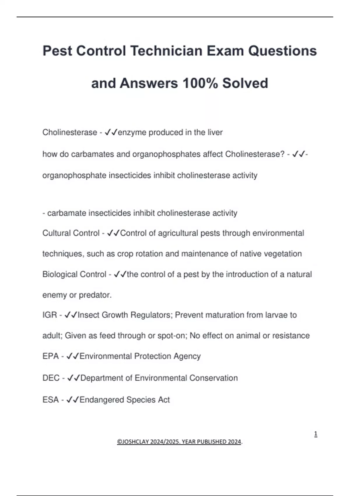 Pest Control Technician Exam Questions and Answers 100% Solved Cholinesterase - enzyme produced in the liver how do carbamates and organophosphates affect Cholinesterase? - - organophosphate insecticides inhibit cholinesterase activity - carbamate insecticides inhibit cholinesterase activity Cultural Control - Control of agricultural pests through environmental techniques, such as crop rotation and maintenance of native vegetation Biological Control - the control of a pest by the introduction of a natural enemy or predator. IGR - Insect Growth Regulators; Prevent maturation from larvae to adult; Given as feed through or spot-on; No effect on animal or resistance EPA - Environmental Protection Agency DEC - Department of Environmental Conservation ESA - Endangered Species Act