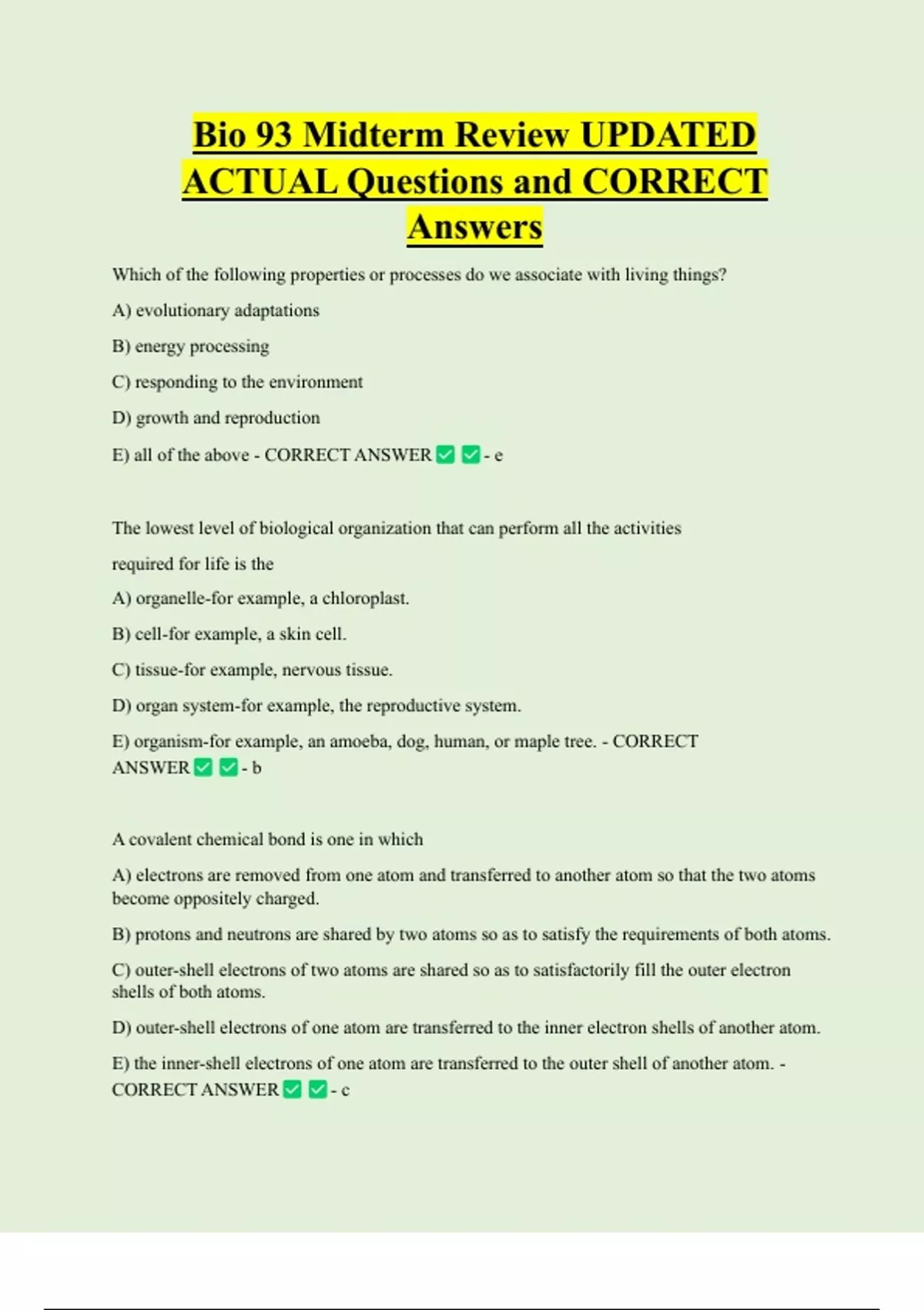 Bio 93 Midterm Review UPDATED ACTUAL Questions and CORRECT Answers