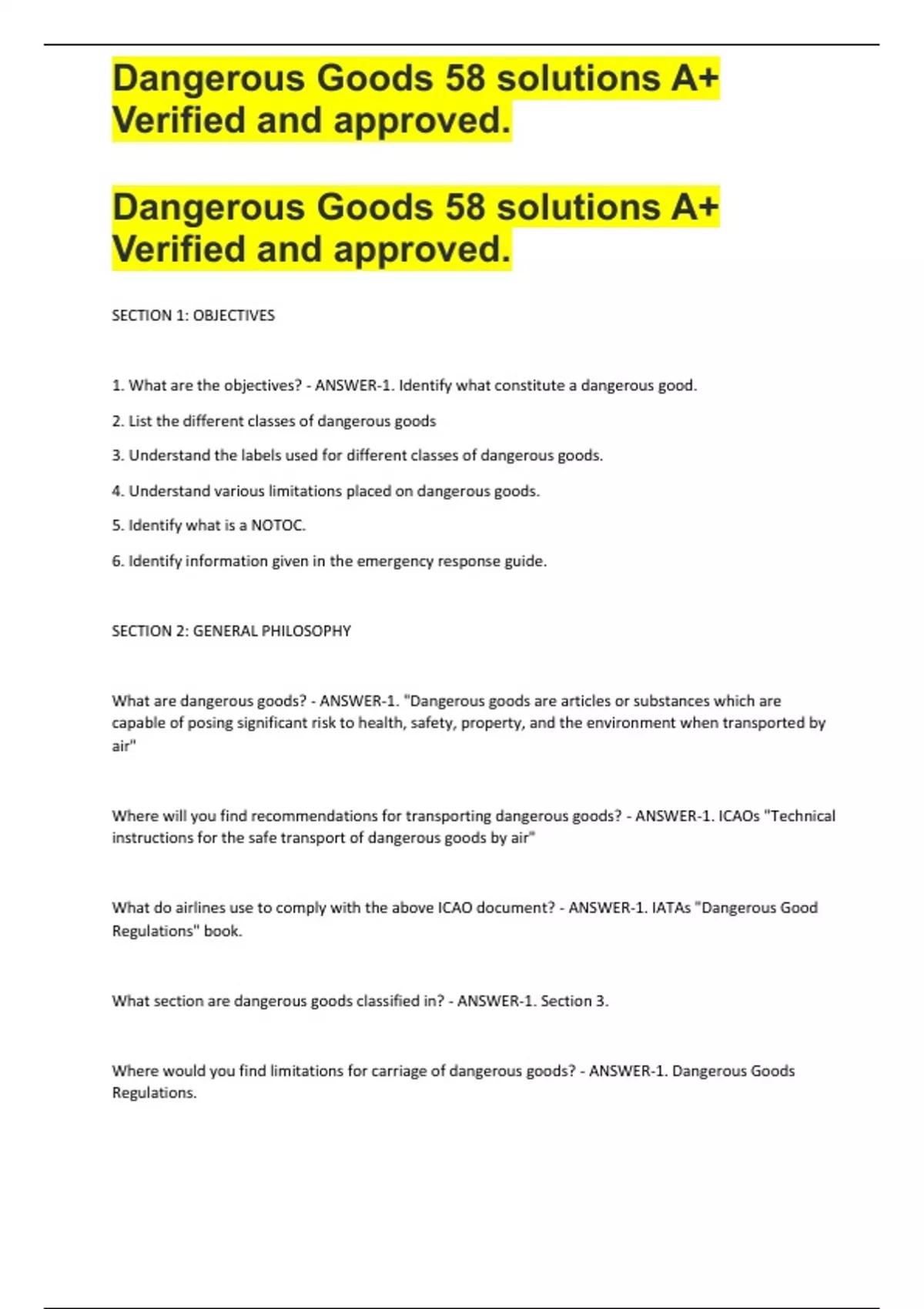 SECTION 1: OBJECTIVES 1. What are the objectives? - ANSWER-1. Identify what constitute a dangerous good. 2. List the different classes of dangerous goods 3. Understand the labels used for different classes of dangerous goods. 4. Understand various limitations placed on dangerous goods. 5. Identify what is a NOTOC. 6. Identify information given in the emergency response guide. SECTION 2: GENERAL PHILOSOPHY