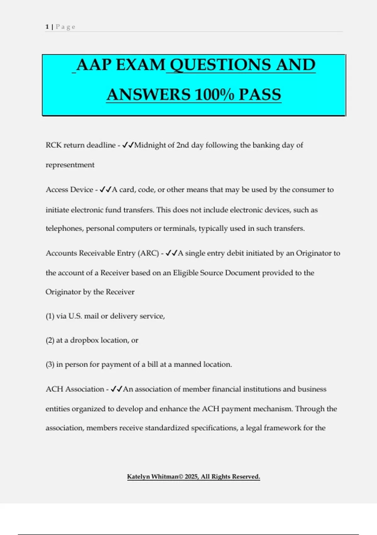 Accounts Receivable Entry (ARC) - ✔✔A single entry debit initiated by an Originator to