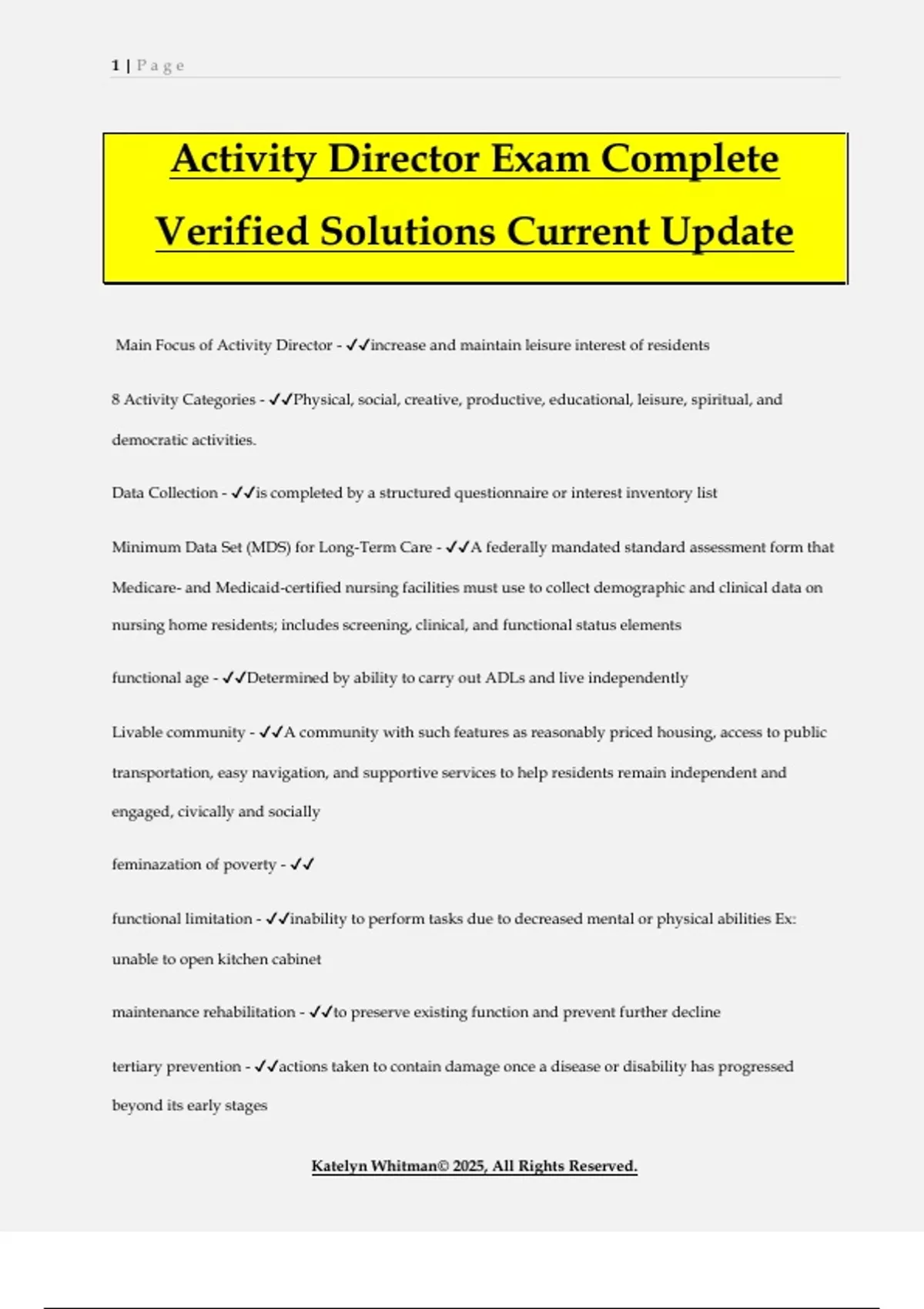 Activity Director Exam Complete Verified Solutions Current Update Main Focus of Activity Director - increase and maintain leisure interest of residents 8 Activity Categories - Physical, social, creative, productive, educational, leisure, spiritual, and democratic activities. Data Collection - is completed by a structured questionnaire or interest inventory list Minimum Data Set (MDS) for Long-Term Care - A federally mandated standard assessment form that Medicare- and Medicaid-certified nursing facilities must use to collect demographic and clinical data on nursing home residents; includes screening, clinical, and functional status elements functional age - Determined by ability to carry out ADLs and live independently Livable community - A community with such features as reasonably priced housing, access to public transportation, easy navigation, and supportive services to help residents remain independent and engaged, civically and socially feminazation of poverty - functional limitation - inability to perform tasks due to decreased mental or physical abilities Ex: unable to open kitchen cabinet maintenance rehabilitation - to preserve existing function and prevent further decline tertiary prevention - actions taken to contain damage once a disease or disability has progressed beyond its early stages 2 | P a g e Katelyn Whitman© 2025, All Rights Reserved. aimed at limiting functional impairment Requirements for long term care facilities MN - Must provide an organized activity and recreation program based on each individual as determined by assessment. Residents must participate in planning. Must be scheduled every day. Must be posted. Penalty for activity director mishap - $300: Not giving required assessments, Activity Director not trained, charging money for activities $100: not regularly scheduled, insufficient staff, inadequate space, equipment, or materials Non SNF (Assisted Living and Assisted Living Plus - Must have periodic opportunities for socialization, but do not have to offer full activity program policies and procedures - subject, purpose, policy, responsibilities, procedure Usually one policy followed by 4 procedures Documentation Requirements - Records might be required by: Licensing Agency/State Regulations, Facility Policies. AD must keep good records of attendance and involvement Documentation Type: Resident Care Plans - Required for every resident Documentation Type: Attendance Participation - Checklist Documentation Type: Initial Note or Assessment - Could use COPM or COTE Documentation Type: Observation Note - Documentation Type: Activity Progress Note - The MDS 3.0 is an assessment completed for individuals in which type of setting? - Long Term Care Facilities 3 | P a g e Katelyn Whitman© 2025, All Rights Reserved. Minimum Data Set Section F - Clients' preferences for customary routines and activities for all facilities funded by Medicare/Medicaid Completed every 3 months Asks about Daily Preferences and Activity Preferences Completion of Minimum Data Set - within 14 days of admission 1 mo after admission 3 months after admission quarterly annually if there is a significant change benchmark - baseline values the system seeks to attain standards - minimal accepted levels of achievement Quality Assurance - a system for ensuring a desired leve