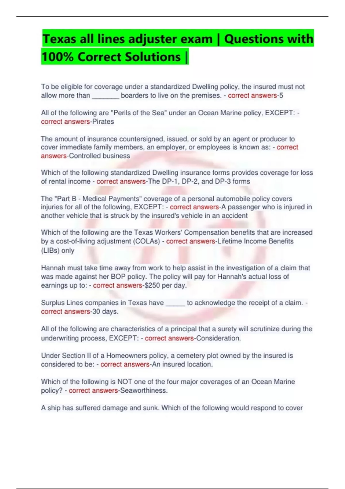 correct answers-Commercial property coverage can be written as both a monoline policy