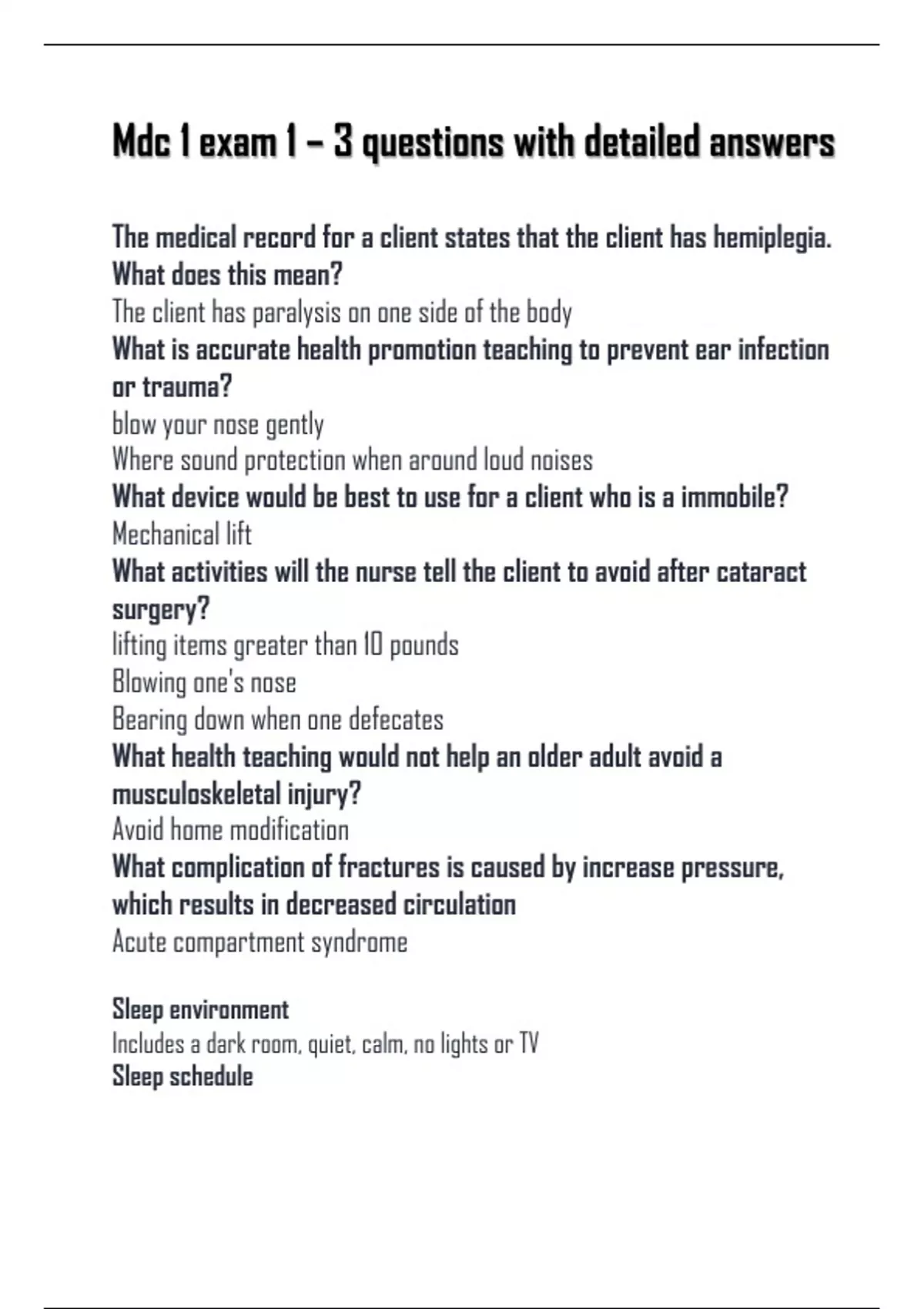 Mdc 1 exam 1 – 3 questions with detailed answers The medical record for a client states that the client has hemiplegia. What does this mean? The client has paralysis on one side of the body What is accurate health promotion teaching to prevent ear infection or trauma? blow your nose gently Where sound protection when around loud noises What device would be best to use for a client who is a immobile? Mechanical lift What activities will the nurse tell the client to avoid after cataract surgery? lifting items greater than 10 pounds Blowing one's nose Bearing down when one defecates What health teaching would not help an older adult avoid a musculoskeletal injury? Avoid home modification What complication of fractures is caused by increase pressure, which results in decreased circulation Acute compartment syndrome Sleep environment Includes a dark room, quiet, calm, no lights or TV Sleep schedule Consistently regular sleep schedule Pre-bed routine Routine to help fall asleep Avoidance Avoiding caffeine or stimulating substances Sleep or mental disorders Conditions like sleep apnea, depression, anxiety Lifestyle/environment Factors like inconsistent sleep schedule, electronic use in bed, noise, or light Physical or medical issues Pain secondary to a diagnosis, medications, nerve disorders, cardiac issues Self-report Most reliable source to measure pain
