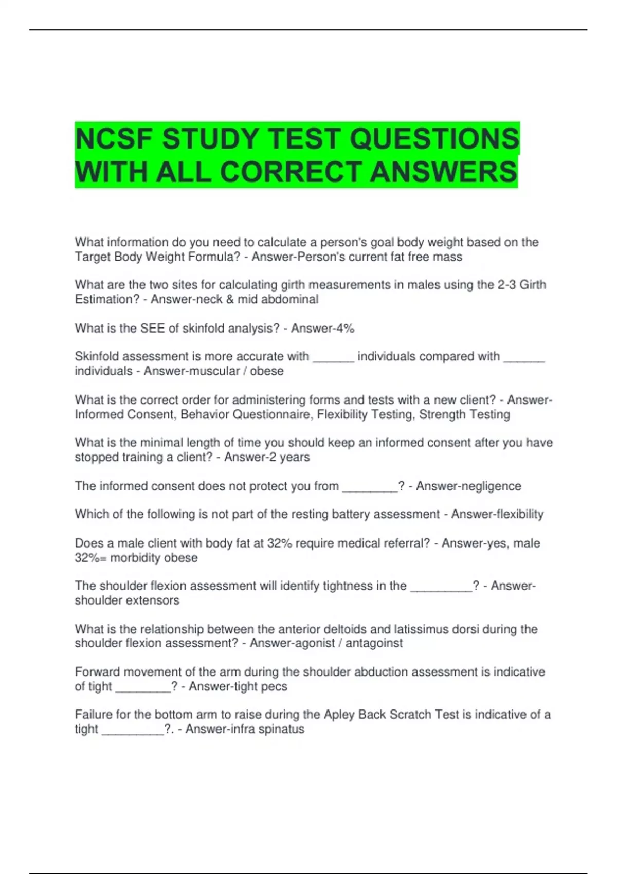 NCSF STUDY TEST QUESTIONS WITH ALL CORRECT ANSWERS What information do you need to calculate a person's goal body weight based on the Target Body Weight Formula? - Answer-Person's current fat free mass What are the two sites for calculating girth measurements in males using the 2-3 Girth Estimation? - Answer-neck & mid abdominal What is the SEE of skinfold analysis? - Answer-4% Skinfold assessment is more accurate with ______ individuals compared with ______ individuals - Answer-muscular / obese What is the correct order for administering forms and tests with a new client? - Answer-Informed Consent, Behavior Questionnaire, Flexibility Testing, Strength Testing What is the minimal length of time you should keep an informed consent after you have stopped training a client? - Answer-2 years The informed consent does not protect you from ________? - Answer-negligence Which of the following is not part of the resting battery assessment - Answer-flexibility Does a male client with body fat at 32% require medical referral? - Answer-yes, male 32%= morbidity obese The shoulder flexion assessment will identify tightness in the _________? - Answer-shoulder extensors What is the relationship between the anterior deltoids and latissimus dorsi during the shoulder flexion assessment? - Answer-agonist / antagoinst Forward movement of the arm during the shoulder abduction assessment is indicative of tight ________? - Answer-tight pecs Failure for the bottom arm to raise during the Apley Back Scratch Test is indicative of a tight _________?. - Answer-infra spinatus A forward elbow of the upper arm during the Apley Back Scratch test is indicative of tight ______. - Answer-internal rotators - subscapulris If the client's spine is misaligned to the right during the trunk flexion test, it is indicative of a tight ____________? - Answer-quadratus lumbordum Failure for the elbows to full extend during the trunk extension test is indicative of tight _________? - Answer-rectus abdominals During the straight leg hip flexion assessment, a client is able to keep their leg straight and get their ankle superior to the hips. What is your conclusion? - Answer-passed test The flexed knee Thomas test assesses flexibility of __________? - Answer-rectus femoris Hip abduction during the Thomas test is indicative of ___________? - Answer-tight him abductors Oxygenated blood is supplied to the myocardial tissue via the ____ - Answer-coronary arteries What is "oxygen uptake"? (VO2) - Answer-Oxygen used by the body during exercise Which source(s) primarily meets the energy demands of a person exercising at near maximal VO2? - Answer-carbohrdrates Which effect does routine aerobic training have on fast twitch muscle fibers? - Answer-Increases the oxidative capacity of type II fibers Which adaptation occurs with improvements in cardiorespiratory fitness? - Answer-Increased oxygen deficit The increased resting metabolism that is often associated with aerobic training is attributed to ______? - Answer-Excess post-exercise oxygen consumption Aerobic exercise has been shown to improve an individual's lipid profile by _____. - Answer-increased hdl Using the Heart Rate Max Formula, what is the predicted maximum heart rate of a 40 year old male with a resting heart rate of 65 beats per minute? - Answer-220-40=180 Reduced cardiovascular efficiency in the first two weeks of training cessation is most attributed to a reduction in _______? - Answer-stroke volume If measured during steady state aerobic exercise, the ______ should experience the smallest change from its resting measurement. - Answer-diastolic bp What is the body's primary method of heat regulation during exercise? - Answer-evaporation During periods of reduced training frequency, how can the detraining effect be minimized? - Answer-increased intensity Which training group would steady state training be the most appropriate for? - Answer-endurance athletes Which training group would steady state training be the most appropriate for? - Answer--The body will adapt to the higher stress level -The adaptation response is quicker -There will be greater metabolic enhancements through EPOC Which of the following activities has the potential to cause serious injury? - Answer-Cable flyes performed on stability ball
