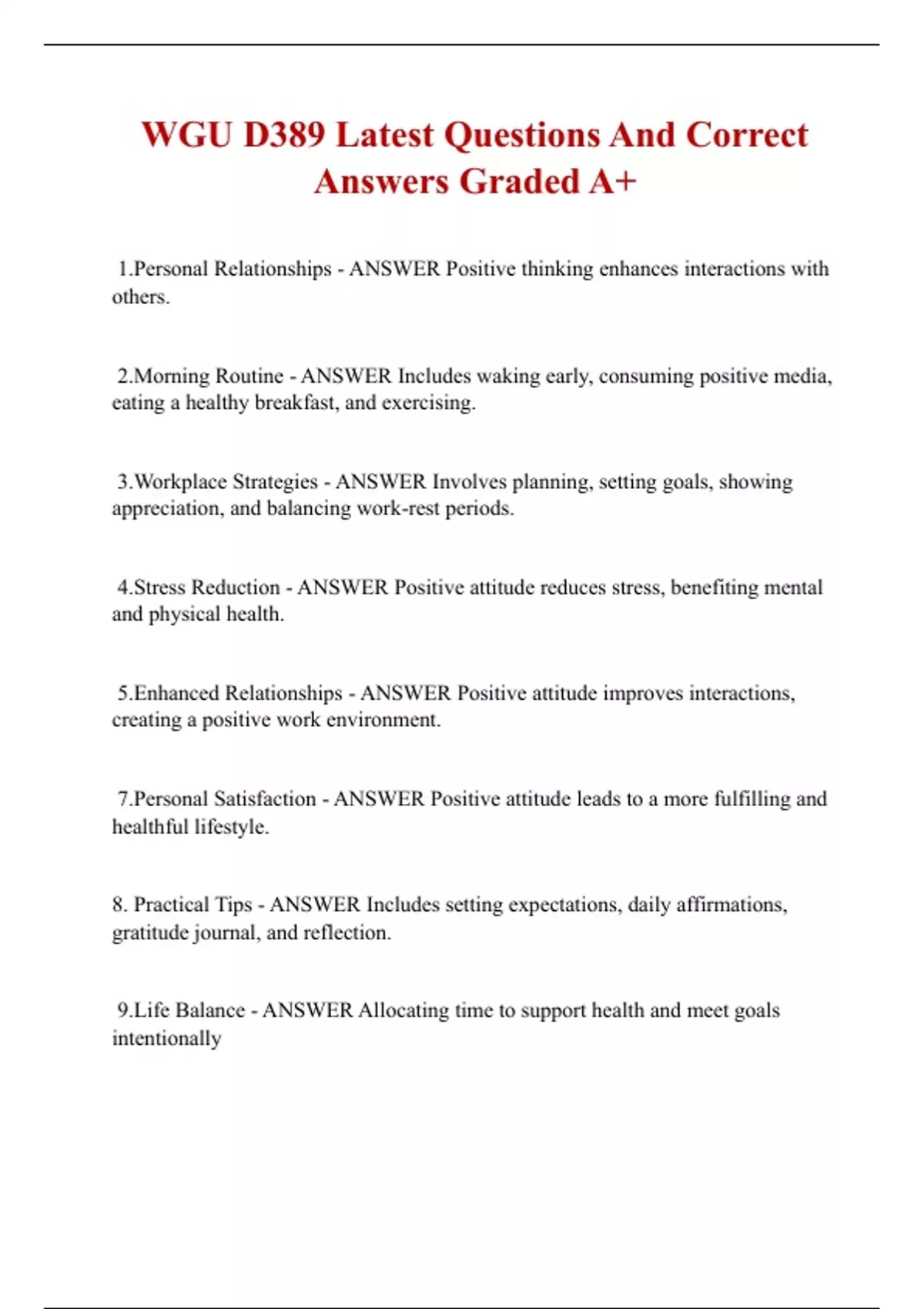1.Personal Relationships - ANSWER Positive thinking enhances interactions with others. 2.Morning Routine - ANSWER Includes waking early, consuming positive media, eating a healthy breakfast, and exercising. 3.Workplace Strategies - ANSWER Involves planning, setting goals, showing appreciation, and balancing work-rest periods. 4.Stress Reduction - ANSWER Positive attitude reduces stress, benefiting mental and physical health. 5.Enhanced Relationships - ANSWER Positive attitude improves interactions, creating a positive work environment. 7.Personal Satisfaction - ANSWER Positive attitude leads to a more fulfilling and healthful lifestyle. 8. Practical Tips - ANSWER Includes setting expectations, daily affirmations, gratitude journal, and reflection. 9.Life Balance - ANSWER Allocating time to support health and meet goals intentionally 10.Goal Setting Importance - ANSWER Provides direction, clarity, and efficient use of study time 11.Reflection in Goal Setting - ANSWER Assessing motivations and past experiences to inspire future goals 12.Goal Setting Tools - ANSWER Worksheets like SMART Goals, Short Term, and Long Term Goals 13.Goal Setting Benefits - ANSWER Aids in creating action plans and tracking progress 14.Effective Goal Setting Steps - ANSWER Identify objectives, measure progress, ensure attainability, relevance, and timeliness 15.Life Balance Strategies - ANSWER Establish support system, prioritize, manage time wisely, include personal time 16.Competency - ANSWER Represents knowledge, skills, and abilities required for course achievement