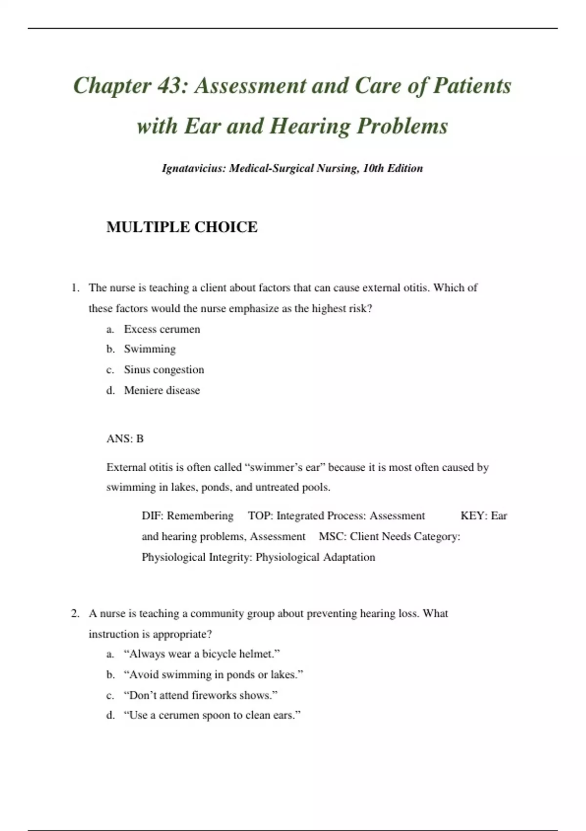1. The nurse is teaching a client about factors that can cause external otitis. Which of