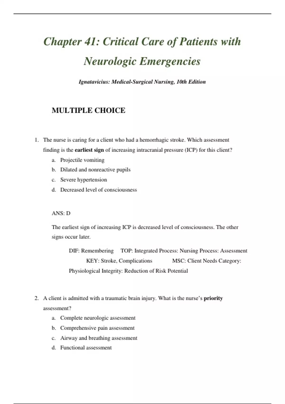2. A client is admitted with a traumatic brain injury. What is the nurse’s priority