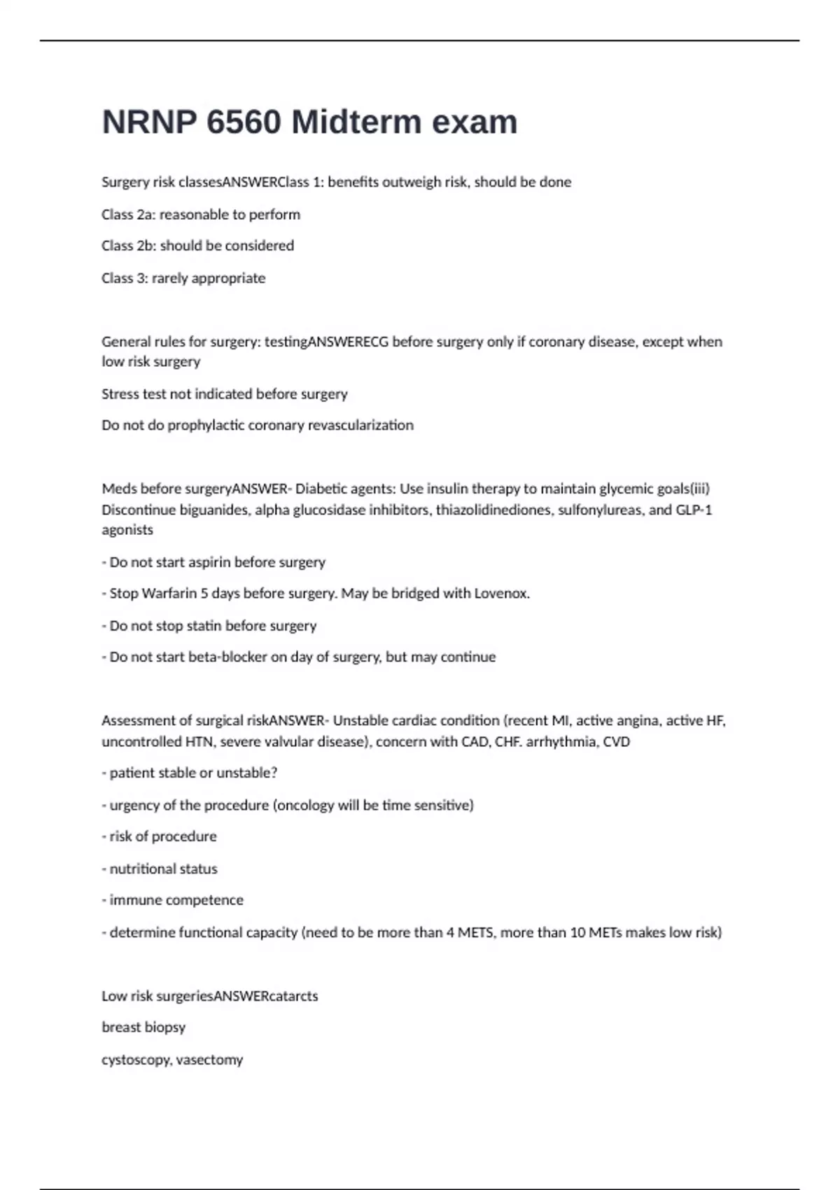 Surgery risk classesANSWERClass 1: benefits outweigh risk, should be done