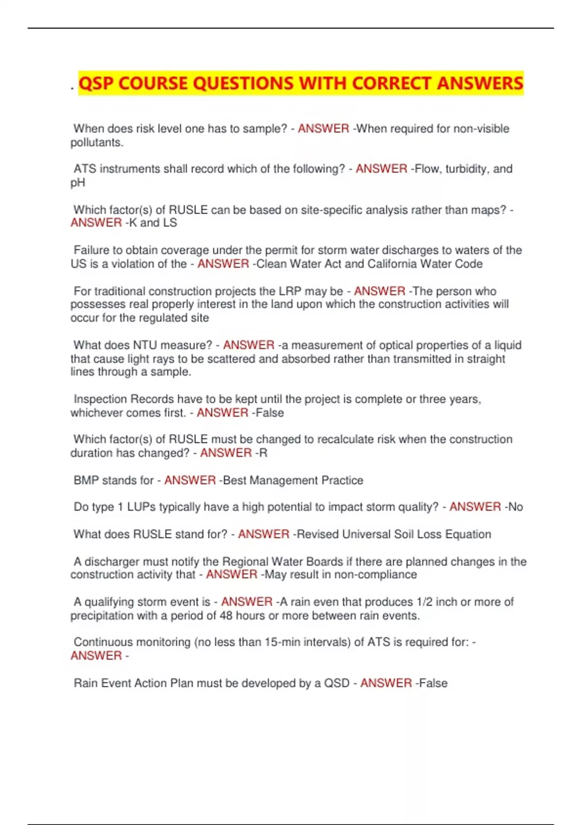 Rain Event Action Plan must be developed by a QSD - ANSWER -False