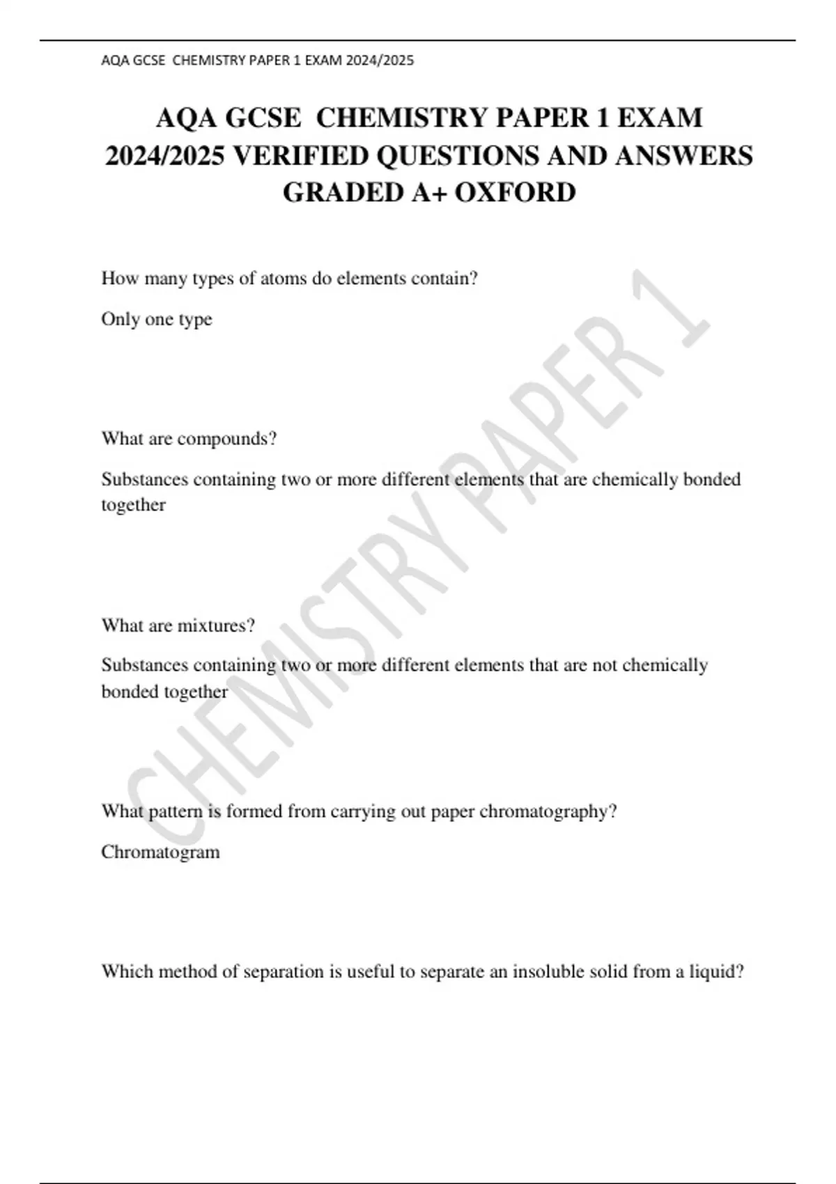 AQA GCSE CHEMISTRY PAPER 1 EXAM 2024/2025 VERIFIED QUESTIONS AND ANSWERS GRADED A+ OXFORD