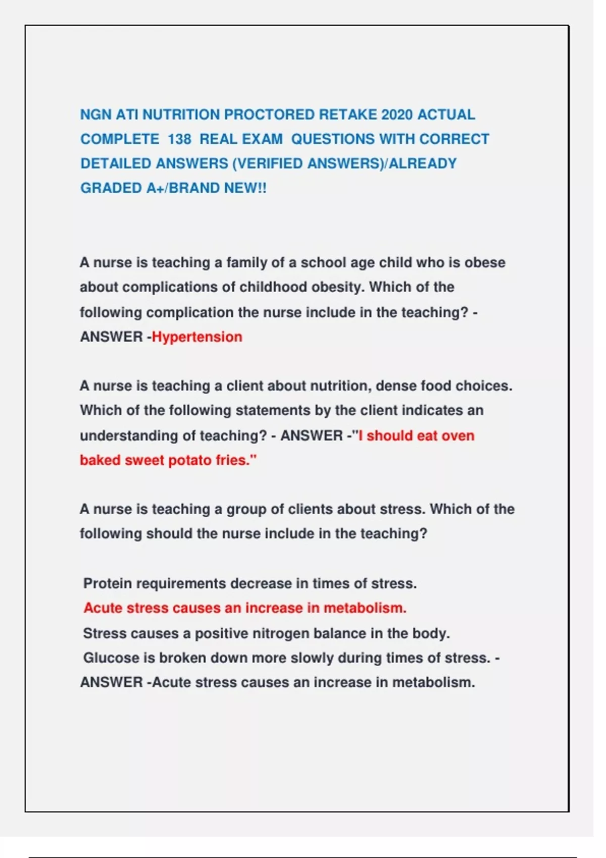 NGN ATI NUTRITION PROCTORED RETAKE 2020 ACTUAL COMPLETE 138 REAL EXAM QUESTIONS WITH CORRECT DETAILED ANSWERS (VERIFIED ANSWERS)/ALREADY GRADED A+/BRAND NEW!! NGN ATI NUTRITION PROCTORED RETAKE 2020 ACTUAL COMPLETE 138 REAL EXAM QUESTIONS WITH CORRECT DETAILED ANSWERS (VERIFIED ANSWERS)/ALREADY GRADED A+/BRAND NEW!! NGN ATI NUTRITION PROCTORED RETAKE 2020 ACTUAL COMPLETE 138 REAL EXAM QUESTIONS WITH CORRECT DETAILED ANSWERS (VERIFIED ANSWERS)/ALREADY GRADED A+/BRAND NEW!! NGN ATI NUTRITION PROCTORED RETAKE 2020 ACTUAL COMPLETE 138 REAL EXAM QUESTIONS WITH CORRECT DETAILED ANSWERS (VERIFIED ANSWERS)/ALREADY GRADED A+/BRAND NEW!! NGN ATI NUTRITION PROCTORED RETAKE 2020 ACTUAL COMPLETE 138 REAL EXAM QUESTIONS WITH CORRECT DETAILED ANSWERS (VERIFIED ANSWERS)/ALREADY GRADED A+/BRAND NEW!! NGN ATI NUTRITION PROCTORED RETAKE 2020 ACTUAL COMPLETE 138 REAL EXAM QUESTIONS WITH CORRECT DETAILED ANSWERS (VERIFIED ANSWERS)/ALREADY GRADED A+/BRAND NEW!! NGN ATI NUTRITION PROCTORED RETAKE 2020 ACTUAL COMPLETE 138 REAL EXAM QUESTIONS WITH CORRECT DETAILED ANSWERS (VERIFIED ANSWERS)/ALREADY GRADED A+/BRAND NEW!! NGN ATI NUTRITION PROCTORED RETAKE 2020 ACTUAL COMPLETE 138 REAL EXAM QUESTIONS WITH CORRECT DETAILED ANSWERS (VERIFIED ANSWERS)/ALREADY GRADED A+/BRAND NEW!! NGN ATI NUTRITION PROCTORED RETAKE 2020 ACTUAL COMPLETE 138 REAL EXAM QUESTIONS WITH CORRECT DETAILED ANSWERS (VERIFIED ANSWERS)/ALREADY GRADED A+/BRAND NEW!!