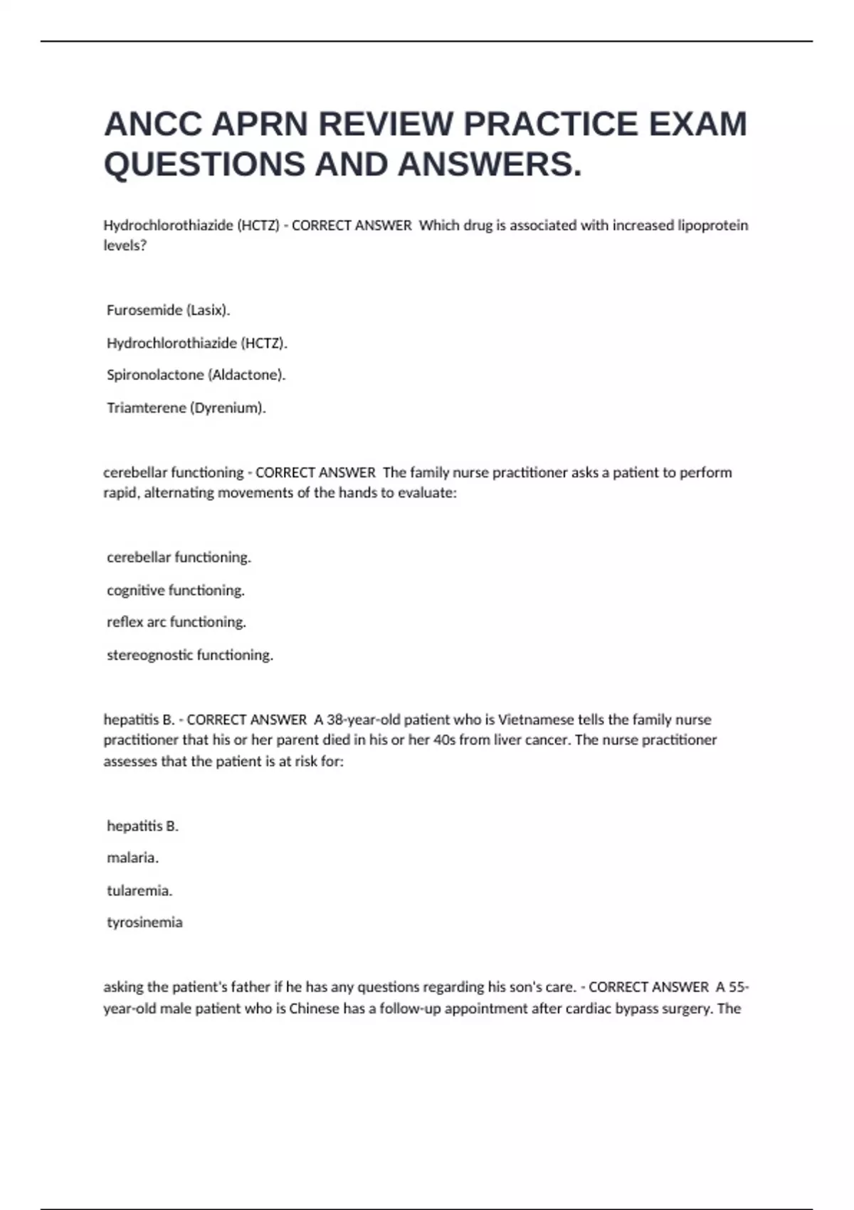 ANCC APRN REVIEW PRACTICE EXAM QUESTIONS AND ANSWERS. Hydrochlorothiazide (HCTZ) - CORRECT ANSWER Which drug is associated with increased lipoprotein levels? Furosemide (Lasix). Hydrochlorothiazide (HCTZ). Spironolactone (Aldactone). Triamterene (Dyrenium). cerebellar functioning - CORRECT ANSWER The family nurse practitioner asks a patient to perform rapid, alternating movements of the hands to evaluate: cerebellar functioning. cognitive functioning. reflex arc functioning. stereognostic functioning. hepatitis B. - CORRECT ANSWER A 38-year-old patient who is Vietnamese tells the family nurse practitioner that his or her parent died in his or her 40s from liver cancer. The nurse practitioner assesses that the patient is at risk for: hepatitis B. malaria. tularemia. tyrosinemia asking the patient's father if he has any questions regarding his son's care. - CORRECT ANSWER A 55-year-old male patient who is Chinese has a follow-up appointment after cardiac bypass surgery. The patient brings his father with him into the examination room. The family nurse practitioner provides culturally sensitive care by: asking the patient's father if he has any questions regarding his son's care. asking the patient's father to leave the room due to confidentiality issues. performing the examination without commenting to the patient's father. performing the examination, then telling the patient's father the examination findings. long latency period between exposure and disease development. - CORRECT ANSWER A difficult aspect of determining occupational exposure to disease is the: confidentiality of the information within company records. inaccuracy of occupational disease reporting. long latency period between exposure and disease development. reliance on workers' memories. creating a task force to address scope-of-practice concerns. - CORRECT ANSWER The family nurse practitioner exhibits professional leadership by: adding clinical protocols to the nurse practitioner scope of practice. comparing the workplace roles of the registered nurse and the nurse practitioner. creating a task force to address scope-of-practice concerns. lobbying to eliminate continuing education requirements. evaluation and management code with history, examination and medical decision making - CORRECT ANSWER To comply with regulations for third-party payor reimbursement and documentation, a family nurse practitioner correlates: evaluation and management code with history, examination and medical decision making. health outcomes with physical examination findings and plan of care. medication orders and treatment plan with electronic billing. patient privacy with informed consent. vocational rehabilitation services. - CORRECT ANSWER The family nurse practitioner examines a patient who has sustained a non-work-related injury that interferes with the patient's ability to perform his or her job. The patient does not qualify for medical disability and has a reasonable chance of engaging in a suitable occupation with proper therapy. The nurse practitioner recommends that the patient apply for: Family and Medical Leave Act benefits. home health services. Social Security benefits. vocational rehabilitation services. requesting a referral for evaluation of the larynx. - CORRECT ANSWER A 45-year-old patient who is an opera singer reports progressive hoarseness for the last four weeks. The hoarseness began after a three-hour opera performance. The patient does not smoke and reports no weight loss, upper respiratory infection, dysphagia, or shortness of breath. The family nurse practitioner manages this patient by: ordering a computed tomography scan of the head. ordering an immediate lateral neck x-ray. prescribing systemic antibiotics and cool mist inhalations. requesting a referral for evaluation of the larynx. one month and six months. - CORRECT ANSWER Routine immunization guidelines recommend administering the hepatitis B vaccine at birth and repeating doses at: one month and six months. one month and two months. four months and two years. six months and 12 months.