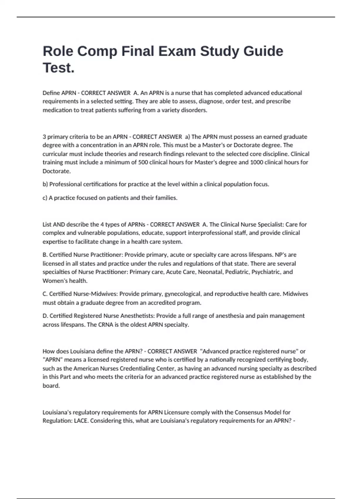 Role Comp Final Exam Study Guide Test. Define APRN - CORRECT ANSWER A. An APRN is a nurse that has completed advanced educational requirements in a selected setting. They are able to assess, diagnose, order test, and prescribe medication to treat patients suffering from a variety disorders. 3 primary criteria to be an APRN - CORRECT ANSWER a) The APRN must possess an earned graduate degree with a concentration in an APRN role. This must be a Master's or Doctorate degree. The curricular must include theories and research findings relevant to the selected core discipline. Clinical training must include a minimum of 500 clinical hours for Master's degree and 1000 clinical hours for Doctorate. b) Professional certifications for practice at the level within a clinical population focus. c) A practice focused on patients and their families. List AND describe the 4 types of APRNs - CORRECT ANSWER A. The Clinical Nurse Specialist: Care for complex and vulnerable populations, educate, support interprofessional staff, and provide clinical expertise to facilitate change in a health care system. B. Certified Nurse Practitioner: Provide primary, acute or specialty care across lifespans. NP's are licensed in all states and practice under the rules and regulations of that state. There are several specialties of Nurse Practitioner: Primary care, Acute Care, Neonatal, Pediatric, Psychiatric, and Women's health. C. Certified Nurse-Midwives: Provide primary, gynecological, and reproductive health care. Midwives must obtain a graduate degree from an accredited program. D. Certified Registered Nurse Anesthetists: Provide a full range of anesthesia and pain management across lifespans. The CRNA is the oldest APRN specialty. How does Louisiana define the APRN? - CORRECT ANSWER "Advanced practice registered nurse" or "APRN" means a licensed registered nurse who is certified by a nationally recognized certifying body, such as the American Nurses Credentialing Center, as having an advanced nursing specialty as described in this Part and who meets the criteria for an advanced practice registered nurse as established by the board. Louisiana's regulatory requirements for APRN Licensure comply with the Consensus Model for Regulation: LACE. Considering this, what are Louisiana's regulatory requirements for an APRN? - CORRECT ANSWER A. "Advanced practice registered nursing" means nursing by a certified registered nurse anesthetist, certified nurse midwife, clinical nurse specialist, or nurse practitioner which is based on knowledge and skills acquired in a basic nursing education program, licensure as a registered nurse, and a minimum of a master's degree with a concentration in the respective advanced practice nursing specialty which includes both didactic and clinical components, advanced knowledge in nursing theory, physical and psychosocial assessment, nursing interventions, and management of health care. The APRN must hold a current, unencumbered nursing license in Louisiana. Continuing education is required annually for licensure and the APRN that has prescriptive authority and active controlled dangerous substance (CDS) license must complete an additional 3 hours of education that includes best practices for the prescribing of CDS, drug diversion training, appropriate treatment for addiction, and the treatment of chronic pain Define NP (include - what does an NP do? What services do NPs provide??) - CORRECT ANSWER A. Nurse Practitioners are Advanced Nurse Practitioner's that specialize in areas of care. The specialties include: Family Practice, Adult-Geriatric (Acute or Primary), Pediatric (Acute or Primary), Psychiatric Mental Health, Neonatal, and Women's Health. NP's provide care in almost all clinical setting such as in hospital, clinics, or primary care provider offices. NP's have the ability to assess, order diagnostic test, labs, and order prescriptions to prevent or treat diseases on all spectrums.