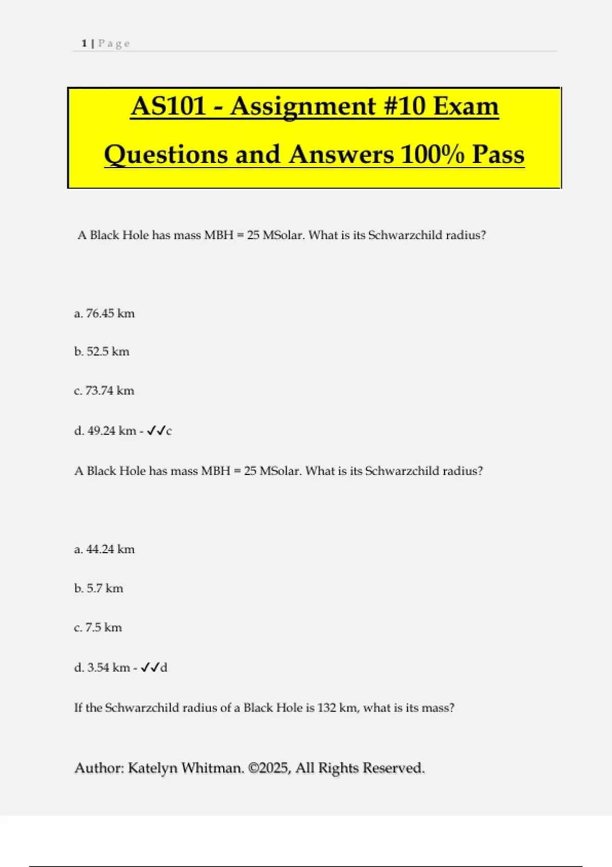 AS101 - Assignment #10 Exam Questions and Answers 100% Pass A Black Hole has mass MBH = 25 MSolar. What is its Schwarzchild radius? a. 76.45 km b. 52.5 km c. 73.74 km d. 49.24 km - c A Black Hole has mass MBH = 25 MSolar. What is its Schwarzchild radius? a. 44.24 km b. 5.7 km c. 7.5 km d. 3.54 km - d If the Schwarzchild radius of a Black Hole is 132 km, what is its mass? 2 | P a g e Author: Katelyn Whitman. ©2025, All Rights Reserved. a. 120 Msolar b. 44.76 Msolar c. 63.8 Msolar d. 35 Msolar - b Why are black holes black? a. Because nothing escapes b. Because radiation does not escape c. Because light does not escape d. Because they do not have any energy - c What is at the center of a black hole? a. an X-ray source b. the singularity point c. another black hole d. a little galaxy - b 3 | P a g e Author: Katelyn Whitman. ©2025, All Rights Reserved. What is a supermassive black hole? a. black hole with mass similar to the sun b. black hole with mass (thousand - billion) Msolar c. black hole with mass similar to Jupiter d. black hole with mass similar to 3Msolar - b How were the Black Holes predicted? a. with optical telescopes b. with radio telescopes c. mathematically using Einsteind's general relativity theory d. by observation - c Hawking radiation is black bod