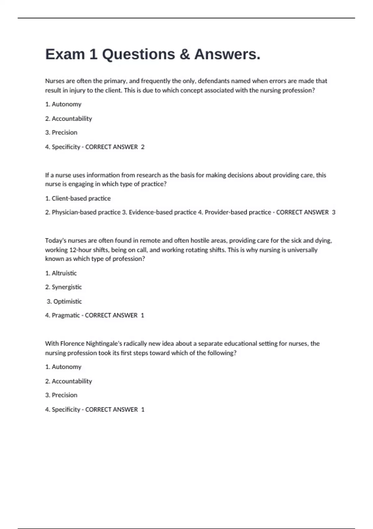 Exam 1 Questions & Answers. Nurses are often the primary, and frequently the only, defendants named when errors are made that result in injury to the client. This is due to which concept associated with the nursing profession? 1. Autonomy 2. Accountability 3. Precision 4. Specificity - CORRECT ANSWER 2 If a nurse uses information from research as the basis for making decisions about providing care, this nurse is engaging in which type of practice? 1. Client-based practice 2. Physician-based practice 3. Evidence-based practice 4. Provider-based practice - CORRECT ANSWER 3 Today's nurses are often found in remote and often hostile areas, providing care for the sick and dying, working 12-hour shifts, being on call, and working rotating shifts. This is why nursing is universally known as which type of profession? 1. Altruistic 2. Synergistic 3. Optimistic 4. Pragmatic - CORRECT ANSWER 1 With Florence Nightingale's radically new idea about a separate educational setting for nurses, the nursing profession took its first steps toward which of the following? 1. Autonomy 2. Accountability 3. Precision 4. Specificity - CORRECT ANSWER 1 If an advanced practice nurse is prepared to provide direct client care in primary care settings, focusing on health promotion, illness prevention, early diagnosis, and treatment of common health problems, this nurse is acting in which advanced practice role? 1. Nurse practitioner 2. Certified nurse midwife 3. Clinical nurse specialist 4. Case manager - CORRECT ANSWER 1 If an advanced practice nurse focuses on the care of pregnant women before, during, and after the birth process, this nurse is acting in which advanced practice role? 1. Nurse practitioner 2. Certified nurse midwife 3. Clinical nurse specialist 4. Case manager - CORRECT ANSWER 2 If an advanced practice nurse is comfortable working in high-tech environments with seriously ill individuals and their families, this nurse is acting in which advanced practice role? 1. Nurse practitioner 2. Certified nurse midwife 3. Clinical nurse specialist 4. Case manager - CORRECT ANSWER 3 If an advanced practice nurse functions to coordinate services for clients with high-risk or longterm health problems who require access to the full continuum of health-care services, this nurse is acting in which advanced practice role? 1. Nurse practitioner 2. Certified nurse midwife 3. Clinical nurse specialist 4. Case manager - CORRECT ANSWER 4 If a nurse taking action to perform the activities that promote patient care, this nurse is acting with which of the following? 1. Power 2. Control 3. Authority 4. Empowerment - CORRECT ANSWER 4 Although the client likely would prefer to avoid taking medications, tolerating uncomfortable treatments, and participating in demanding activities, he or she cooperates because the nurse has a good relationship with the client; this is an example of which type of power? 1. Referent power 2. Expert power 3. Coercive power 4. Legitimate power - CORRECT ANSWER 1 By demonstrating their knowledge of the client's condition, recent laboratory tests, and other elements that are vital to the client's recovery, nurses demonstrate which type of power? 1. Referent power 2. Expert power 3. Coercive power 4. Legitimate power - CORRECT ANSWER 2 If a nurse employs the underlying principles in the process of behavior modification, the nurse is utilizing which type of power? 1. Referent power 2. Expert power 3. Coercive power 4. Power of rewards - CORRECT ANSWER 4 If a nurse uses which type of power, it can destroy therapeutic and personal relationships, and it can also be considered unethical and even illegal in certain situations? 1. Referent power 2. Expert power 3. Coercive power 4. Power of rewards - CORRECT ANSWER 3 Nursing decisions made about client care can come only from individuals who have which source of power? 1. Referent power 2. Expert power 3. Coercive power 4. Legitimate power - CORRECT ANSWER 4 The first, and certainly the most important, way in which nurses can gain power in all areas is through which action? 1. Professional unity 2. Political activity 3. Accountability and professionalism 4. Networking - CORRECT ANSWER 1 The nursing profession tends to use which term when attempting to explain apparent relationships between observed behaviors and their effects on a client's health? 1. Model 2. Theory 3. Hypothesis 4. Evidence - CORRECT ANSWER 2 Which of the following is a very important element in the Roy adaptation model because it provides baseline data about the client that the nurse obtains through assessment techniques? 1. Input 2. Output 3. Feedback 4. Throughput - CORRECT ANSWER 2