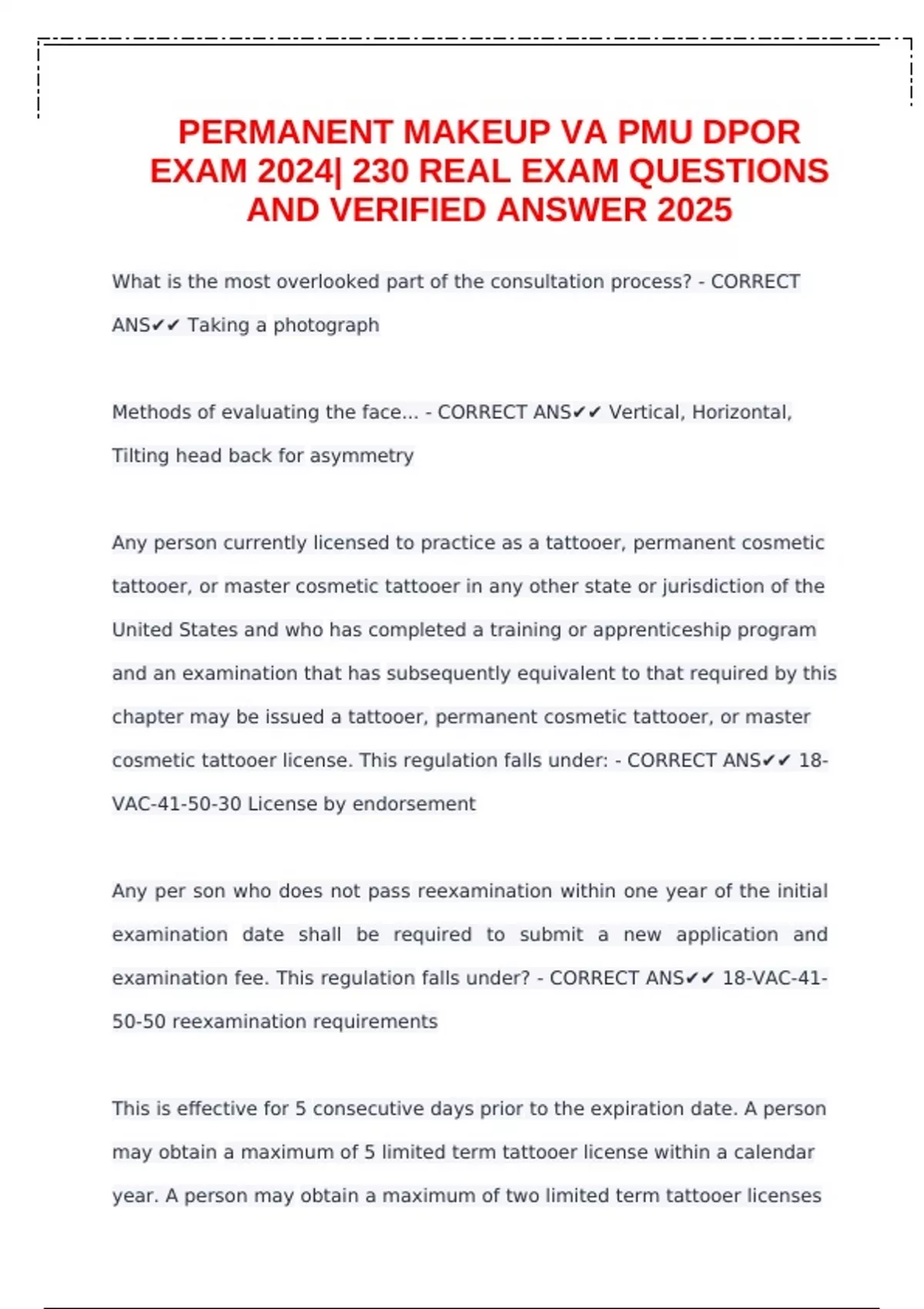 PERMANENT MAKEUP VA PMU DPOR EXAM 2024| 230 REAL EXAM QUESTIONS AND VERIFIED ANSWER 2025