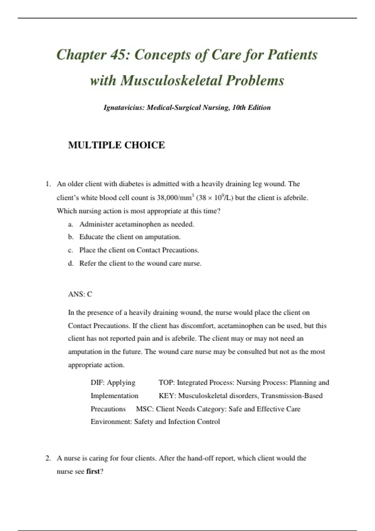 1. An older client with diabetes is admitted with a heavily draining leg wound. The