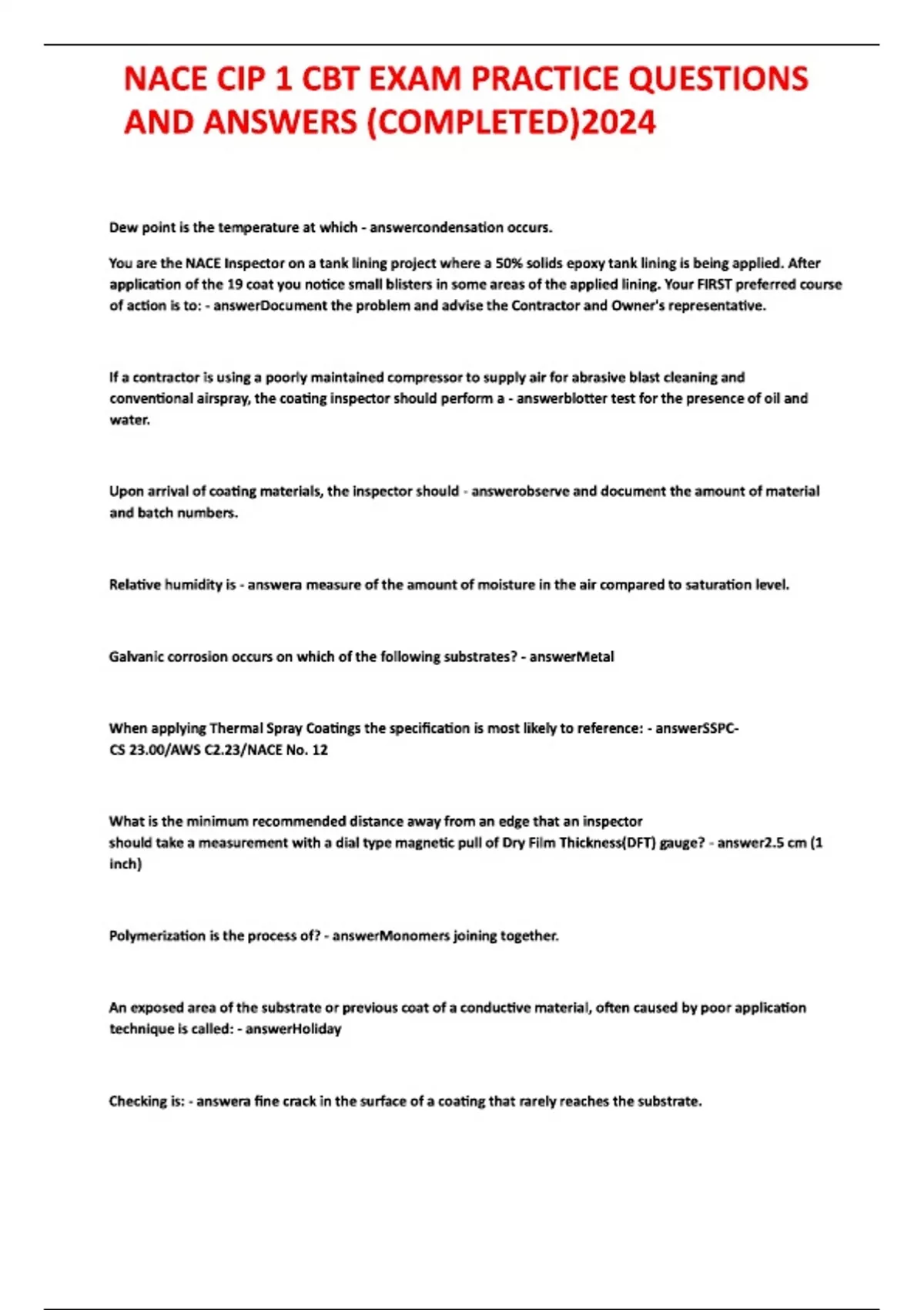 NACE CIP 1 CBT EXAM PRACTICE QUESTIONS AND ANSWERS (COMPLETED) 2024NACE CIP 1 CBT EXAM PRACTICE QUESTIONS AND ANSWERS (COMPLETED) 2024NACE CIP 1 CBT EXAM PRACTICE QUESTIONS AND ANSWERS (COMPLETED) 2024NACE CIP 1 CBT EXAM PRACTICE QUESTIONS AND ANSWERS (COMPLETED) 2024NACE CIP 1 CBT EXAM PRACTICE QUESTIONS AND ANSWERS (COMPLETED) 2024NACE CIP 1 CBT EXAM PRACTICE QUESTIONS AND ANSWERS (COMPLETED) 2024NACE CIP 1 CBT EXAM PRACTICE QUESTIONS AND ANSWERS (COMPLETED) 2024NACE CIP 1 CBT EXAM PRACTICE QUESTIONS AND ANSWERS (COMPLETED) 2024NACE CIP 1 CBT EXAM PRACTICE QUESTIONS AND ANSWERS (COMPLETED) 2024NACE CIP 1 CBT EXAM PRACTICE QUESTIONS AND ANSWERS (COMPLETED) 2024