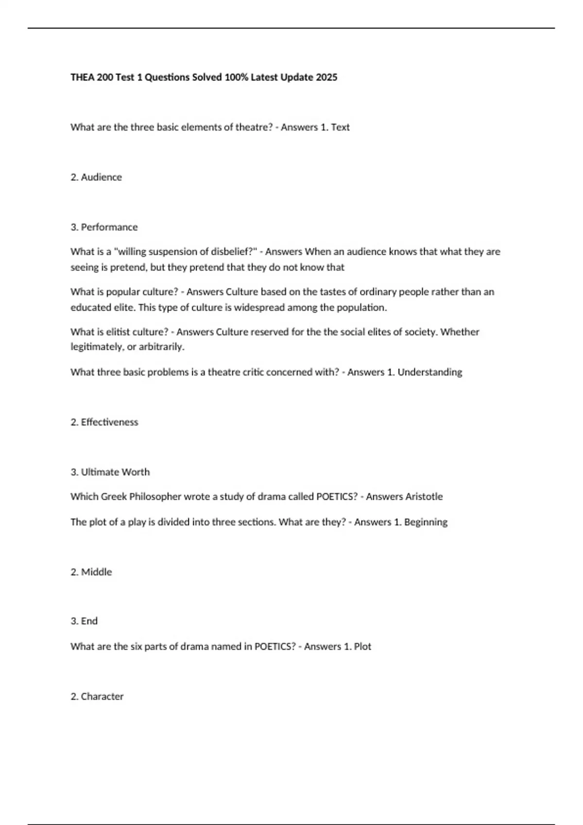 THEA 200 Test 1 Questions Solved 100% Latest Update 2025 What are the three basic elements of theatre? - Answers 1. Text 2. Audience 3. Performance What is a "willing suspension of disbelief?" - Answers When an audience knows that what they are seeing is pretend, but they pretend that they do not know that What is popular culture? - Answers Culture based on the tastes of ordinary people rather than an educated elite. This type of culture is widespread among the population. What is elitist culture? - Answers Culture reserved for the the social elites of society. Whether legitimately, or arbitrarily. What three basic problems is a theatre critic concerned with? - Answers 1. Understanding 2. Effectiveness 3. Ultimate Worth Which Greek Philosopher wrote a study of drama called POETICS? - Answers Aristotle The plot of a play is divided into three sections. What are they? - Answers 1. Beginning 2. Middle 3. End What are the six parts of drama named in POETICS? - Answers 1. Plot 2. Character 3. Thought 4. Diction 5. Music 6. Spectacle What are the two types of plot structures. Which is the most common? - Answers 1. Climactic 2. Episodic Climactic is the most common In POETICS, the part of drama called "thought" concerns what? - Answers Theme What is the point of attack in a play? - Answers Point in which the story begins picking up; beginning of conflict What is exposition - Answers Setting forth of information, whether through character dialogue or story telling What is a discovery? - Answers Something that is revealed; Revelation of information What is the climax? - Answers Point of highest intensity/dramatic tension What is the crisis? - Answers Sets us off course from reaching the ending of the play. Can include a discovery or complication What is the denouement and when does it typically occur? - Answers The point of final resolution in the play. Tying up of loose ends and questions are answered. Occurs after the climax. How is character revealed in a script (play)? - Answers 1. Dialogue/ interactions with