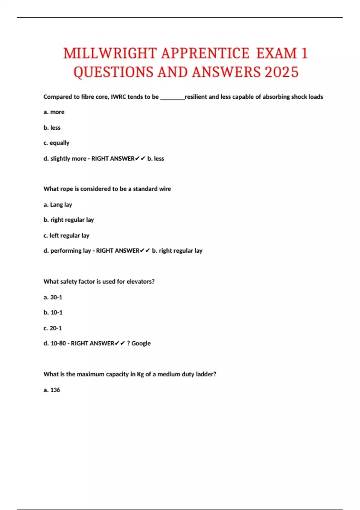 MILLWRIGHT APPRENTICE EXAM 1 QUESTIONS AND ANSWERS 2025