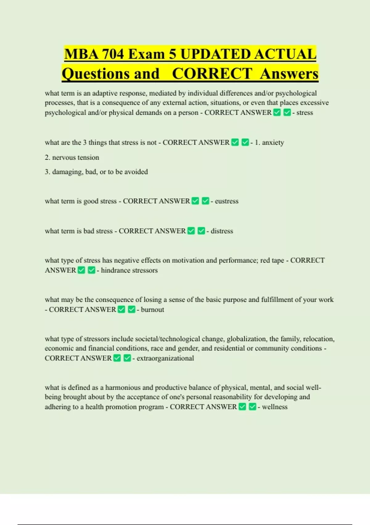 MBA 704 Exam 5 UPDATED ACTUAL Questions and CORRECT Answers what term is an adaptive response, mediated by individual differences and/or psychological processes, that is a consequence of any external action, situations, or even that places excessive psychological and/or physical demands on a person - CORRECT ANSWER - stress what are the 3 things that stress is not - CORRECT ANSWER - 1. anxiety 2. nervous tension 3. damaging, bad, or to be avoided