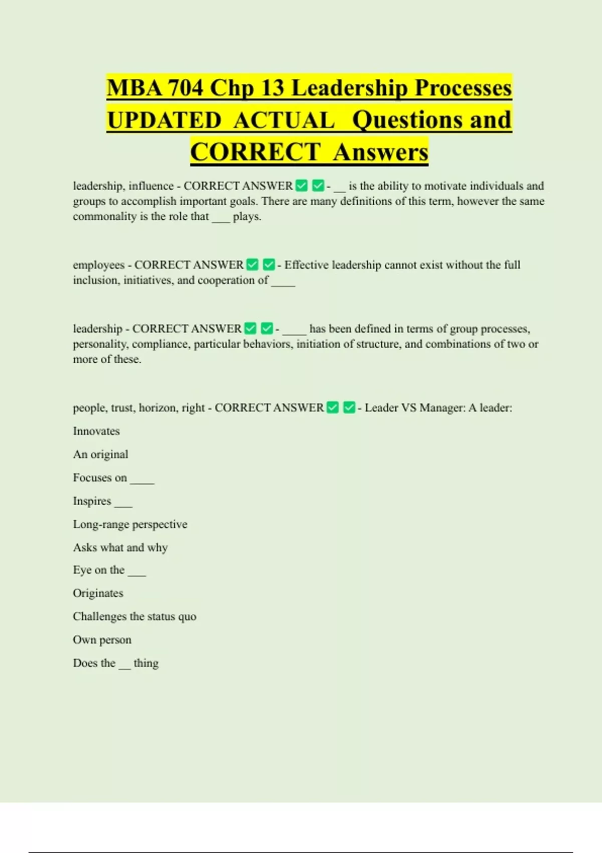 MBA 704 Chp 13 Leadership Processes UPDATED ACTUAL Questions and CORRECT Answers