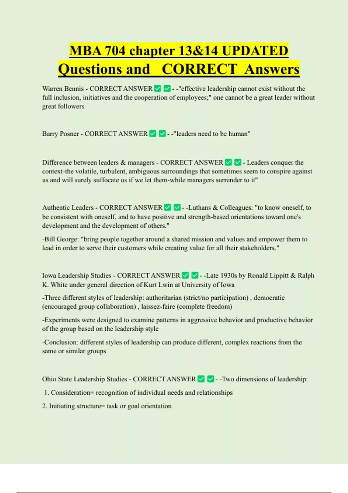 MBA 704 chapter 13&14 UPDATED Questions and CORRECT Answers Warren Bennis - CORRECT ANSWER - -"effective leadership cannot exist without the full inclusion, initiatives and the cooperation of employees;" one cannot be a great leader without great followers Barry Posner - CORRECT ANSWER - -"leaders need to be human"