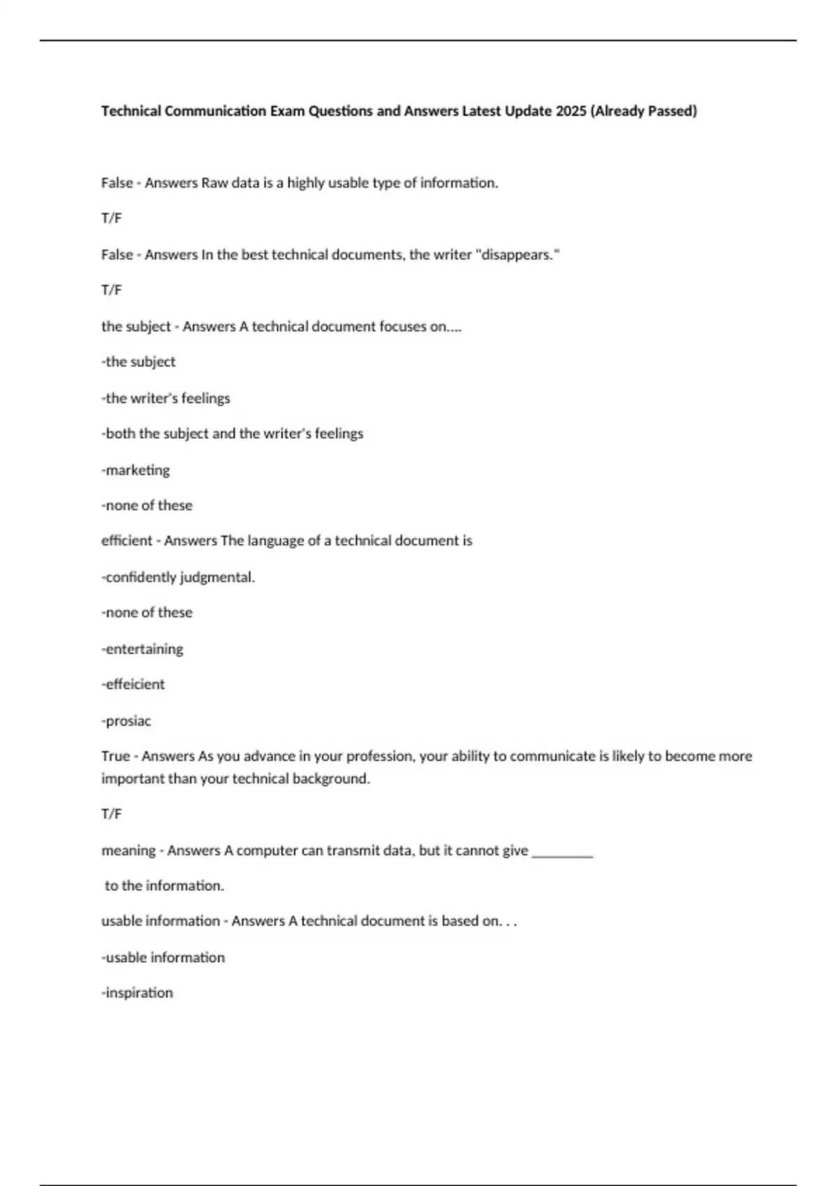 Technical Communication Exam Questions and Answers Latest Update 2025 (Already Passed) False - Answers Raw data is a highly usable type of information. T/F False - Answers In the best technical documents, the writer "disappears." T/F the subject - Answers A technical document focuses on.... -the subject -the writer's feelings -both the subject and the writer's feelings -marketing -none of these efficient - Answers The language of a technical document is -confidently judgmental. -none of these -entertaining -effeicient -prosiac True - Answers As you advance in your profession, your ability to communicate is likely to become more important than your technical background. T/F meaning - Answers A computer can transmit data, but it cannot give ________ to the information. usable information - Answers A technical document is based on. . . -usable information -inspiration -the writer's deepest impressions -intuition -none of these False - Answers Effective communicators "let the data speak for themselves." T/F False - Answers Direct, straightforward communication is valued by all cultures. T/F communication - Answers Executives consistently rank ________ skills as the most vital of employee qualities. middle - Answers For best emphasis, avoid placing the key word or phrase at the sentence's. . . -terminal -end -beginning -middle False - Answers Whenever possible, you should preface your assertions with "I think," "In my opinion," "I believe," or some other qualifier. T/F fluent - Answers In its style, an efficient sentence is clear, concise, and. . . -informative 0short -fluent -entertaining -mellifluous False - Answers The passive voice is usually more forceful and direct than the active voice. T/F Independent - Answers When combining sentences, place the idea that deserves most emphasis in a clause that is. . . -subordinate -independent -none of these -relative -dependent False - Answers Never use "I" in technical writing. T/F euphemisms - Answers Technical communicators should generally avoid. . . -topic sentences -euphemisms -active voice -analogies -short sentences False - Answers You should avoid using short sentences in technical writing. T/F True - Answers The less specialized your audience, the fewer acronyms you should use. T/F conversational - Answers For most technical documents, choose a tone that is. . . -prosiac conversational -formal -embracing -serious True - Answers When unable to identify all members of an audience, you should aim at the least specialized members. T/F gives knowledge - Answers When does a message have informative value for its audience? Why do they want it? What do they need to know? - Answers We focus on our audience and purpose by answering these questions: Who wants the report? Who else will read it? List two other questions writers ask about their audience. False - Answers Nontechnical audiences are merely interested in the bare facts, without explanations. T/F True - Answers Primary and secondary audiences often have different technical backgrounds. False - Answers Audience analysis is only necessary when the document is long or complex. T/F False - Answers Primary audiences usually expect a semi technical message. False - Answers Short reports are always written at the lowest level of technicality. T/F often initiated by the writer - Answers Justification reports are unique in that they are. . . -authorized or requested by the readders -often initiated by the writer -rarely written by junior employees -none -complimentary close and signature - Answers A typical memo does not have. . . -topic headings -single spacing -subject line -complimentary close and signature -distribution notation announcement for a company picnic - Answers Use your company's email network to send. . -a formal letter to a client. -all of these -an evaluation of an employee. -an announcement for a company picnic. -a dinner invitation to a colleague. False - Answers A memorandum usually should be no more than one page long. T/F True - Answers Monitoring of email by an employer is legal. T/F paper trail - Answers Memos are major means of written communication within organizations because they. . . leave a "paper trail." are easy to write and read. are less expensive than other communications media. all of these are correct False - Answers As a form of internal correspondence, memos have few legal implications. T/F False - Answers Email increases both the quantity and quality of information. T/F False - Answers Writing in FULL CAPS increases the readability of email. T/F logos - Answers Appeal to logic ethos - Answers appeal to character pathos - Answers appeal to emotion use dramatic typefaces sparingly - Answers For highlighting your document. . . use dramatic typefaces sparingly. use FULL CAPS often. use all of these. use color generously. use long lines of italic type. False - Answers Technical documents usually are read with undivided attention. T/F use a 10 point font - Answers For users who will be facing complex information or difficult steps, you should not. . . increase all white space. shorten the paragraphs. widen the margins. use visuals. use a 10-point or smaller type size. single spaces and double spaces between - Answers For any document that your audience is likely to read completely (such as a letter, memo, or instructions) you should. . . -double-space within paragraphs and triple-space between.