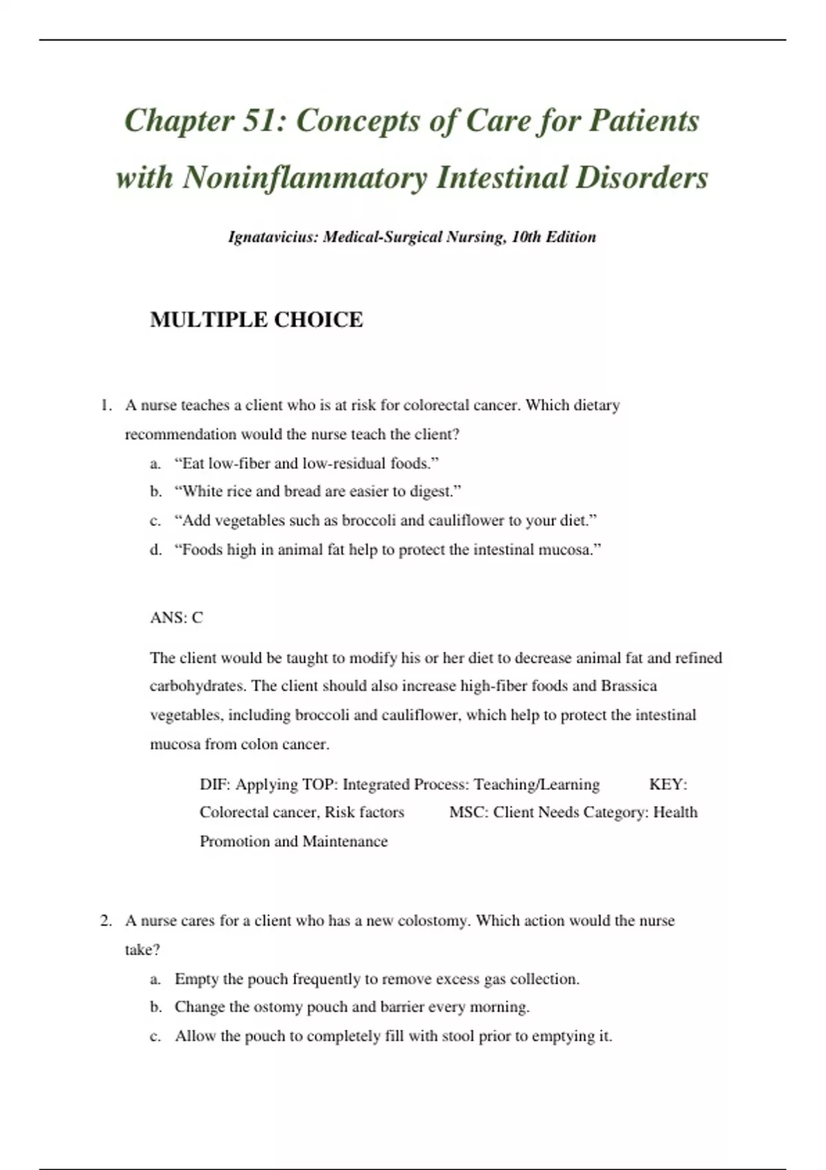 MULTIPLE CHOICE 1. A nurse teaches a client who is at risk for colorectal cancer. Which dietary recommendation would the nurse teach the client? a. “Eat low-fiber and low-residual foods.” b. “White rice and bread are easier to digest.” c. “Add vegetables such as broccoli and cauliflower to your diet.” d. “Foods high in animal fat help to protect the intestinal mucosa.” ANS: C The client would be taught to modify his or her diet to decrease animal fat and refined carbohydrates. The client should also increase high-fiber foods and Brassica vegetables, including broccoli and cauliflower, which help to protect the intestinal mucosa from colon cancer. DIF: Applying TOP: Integrated Process: Teaching/Learning KEY: Colorectal cancer, Risk factors MSC: Client Needs Category: Health Promotion and Maintenance 2. A nurse cares for a client who has a new colostomy. Which action would the nurse take? a. Empty the pouch frequently to remove excess gas collection. b. Change the ostomy pouch and barrier every morning. c. Allow the pouch to completely fill with stool prior to emptying it. d. Use surgical tape to secure the pouch and prevent leakage. ANS: A The nurse would empty the new ostomy pouch frequently because of excess gas collection, and empty the pouch when it is one-third to one-half full of stool. The ostomy pouch does not need to be changed every morning. Ostomy barriers would be used to secure and seal the ostomy appliance; surgical tape would not be used. DIF: Applying TOP: Integrated Process: Nursing Process: Planning and Implementation KEY: Ostomy, Nursing care MSC: Client Needs Category: Physiological Integrity: Basic Care and Comfort 3. A nurse cares for a client who has a family history of colorectal cancer. The client states, “My father and my brother had colon cancer. What is the chance that I will get cancer?” How would the nurse respond? a. “If you eat a low-fat and low-fiber diet, your chances decrease significantly.” b. “You are safe. This is an autosomal dominant disorder that skips generations.” c. “Preemptive surgery and chemotherapy will remove cancer cells and prevent cancer.” d. “You should have a colonoscopy more frequently to identify abnormal polyps early.”
