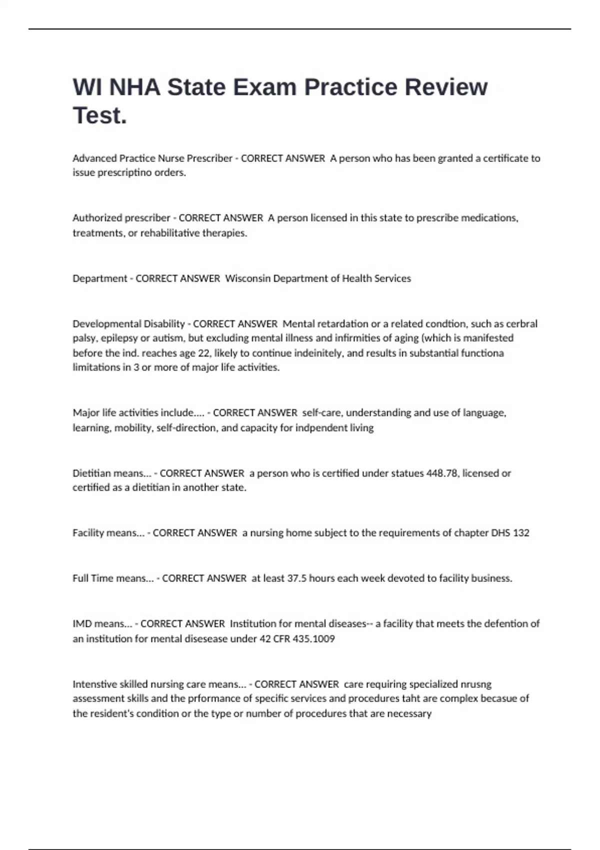 WI NHA State Exam Practice Review Test. Advanced Practice Nurse Prescriber - CORRECT ANSWER A person who has been granted a certificate to issue prescriptino orders. Authorized prescriber - CORRECT ANSWER A person licensed in this state to prescribe medications, treatments, or rehabilitative therapies. Department - CORRECT ANSWER Wisconsin Department of Health Services Developmental Disability - CORRECT ANSWER Mental retardation or a related condtion, such as cerbral palsy, epilepsy or autism, but excluding mental illness and infirmities of aging (which is manifested before the ind. reaches age 22, likely to continue indeinitely, and results in substantial functiona limitations in 3 or more of major life activities. Major life activities include.... - CORRECT ANSWER self-care, understanding and use of language, learning, mobility, self-direction, and capacity for indpendent living Dietitian means... - CORRECT ANSWER a person who is certified under statues 448.78, licensed or certified as a dietitian in another state. Facility means... - CORRECT ANSWER a nursing home subject to the requirements of chapter DHS 132 Full Time means... - CORRECT ANSWER at least 37.5 hours each week devoted to facility business. IMD means... - CORRECT ANSWER Institution for mental diseases-- a facility that meets the defention of an institution for mental disesease under 42 CFR 435.1009 Intenstive skilled nursing care means... - CORRECT ANSWER care requiring specialized nrusng assessment skills and the prformance of specific services and procedures taht are complex becasue of the resident's condition or the type or number of procedures that are necessary Intensive skilled nursing care includes... - CORRECT ANSWER Direct patient observation or montioring or perfomance of complex nursing proedures by registered nurses and licensed practial nurses on a continuing basis, repeated application of complex nursing procedures or services every 24 hours, or frequent montioring and documentaiton of the residnet's condition and response to theraputic measures. Intermediate care facility means... - CORRECT ANSWER a nursing home which is licensed by the department as an intermediate care facility to provide intermediate nursing care. Intermediate nursing care means... - CORRECT ANSWER basic care consisting of physical, emotion, social, and other rehabilitative services under periodic medical supervision. This nursing care requires the skill of an RN for oservaion and recording of reactions and symptoms, and for supervision of nursing care. Most of the resident have long term illnesses or disabilities which may have reached a stable plateau. Other indiviuals may require nursing care to maintain a stabality. Essential supportive consultant services are provided Involuntary administration of psychotropic medication includes any of the following... - CORRECT ANSWER Placing psychotropic medications in and ind. food or drink with knowledge that the ind. protests receipt of the psychotropic meds, forcibly restraining an ind. to enable administration of psychotropic meds, requiring an ind. to take psychotropic medication as a condition of receiving privleges or benefits. License practical nurse means... - CORRECT ANSWER A person licensed as a licesend practical nurse under ch. 441 stats. Limited nursing care means... - CORRECT ANSWER Simple nrsing care procedures required by residents with long term illnesses or disabilities in order to maintain stability and which can be provided safetly only by or under the supervision of a person no less skilled than licensed practicual nurse who works under he direction of an RN. Supervision of the physicial, emotional, social, and rehabilatative needs o the resident is the responsibility of the appropriate health care provider serving under the direction of a physician. Neglect means... - CORRECT ANSWER does not include an act or acts of mere inefficiency, unsatisfactory conduct or failure in good perormance as the result of inability, incapacity, inadvertency or ordinary negligence in isolated instances, or good faith errors in judgement or discretion. Nurse means.... - CORRECT ANSWER a registered nurse or licensed practical nurse Nurse practioner means... - CORRECT ANSWER a registered professional nurse wh meets the requirements of DHS 105.20(1) Nursing assistant means... - CORRECT ANSWER A person who is employed primarily to provide direct care services to residents but is not registered or licensed under ch. 441 stats. Pharmacist means... - CORRECT ANSWER A person registered as a pharmacist under ch. 450 stats. Physician means.... - CORRECT ANSWER A person license to practice medicine or osteopathy under ch. 448 stats. Physical therapist means.... - CORRECT ANSWER a person licensed to pracice physical therapy under ch. 448 stats. Physician extender means... - CORRECT ANSWER A person who is a phsycian's assistant or a nurse practioner acting under the general supervision and direction of a physician. Physician's assistant means... - CORRECT ANSWER A person certified under ch. 448 stats. to perform as a physician's assistant. Practioner means... - CORRECT ANSWER a physician, dentist, podiatrist, or other person permitted by Wisconsin law to distribute, dispense, and administer a controlled substance in the course of professional practice. Protest means... - CORRECT ANSWER Make more than one discernible negative respone, other than mere silence, to the offer of, recommendation for, or other proffering of voluntarry receipt of psychotropic medication. Protest does not mean a discernible negative response to a proposed method of administration of the psychotropic medication.
