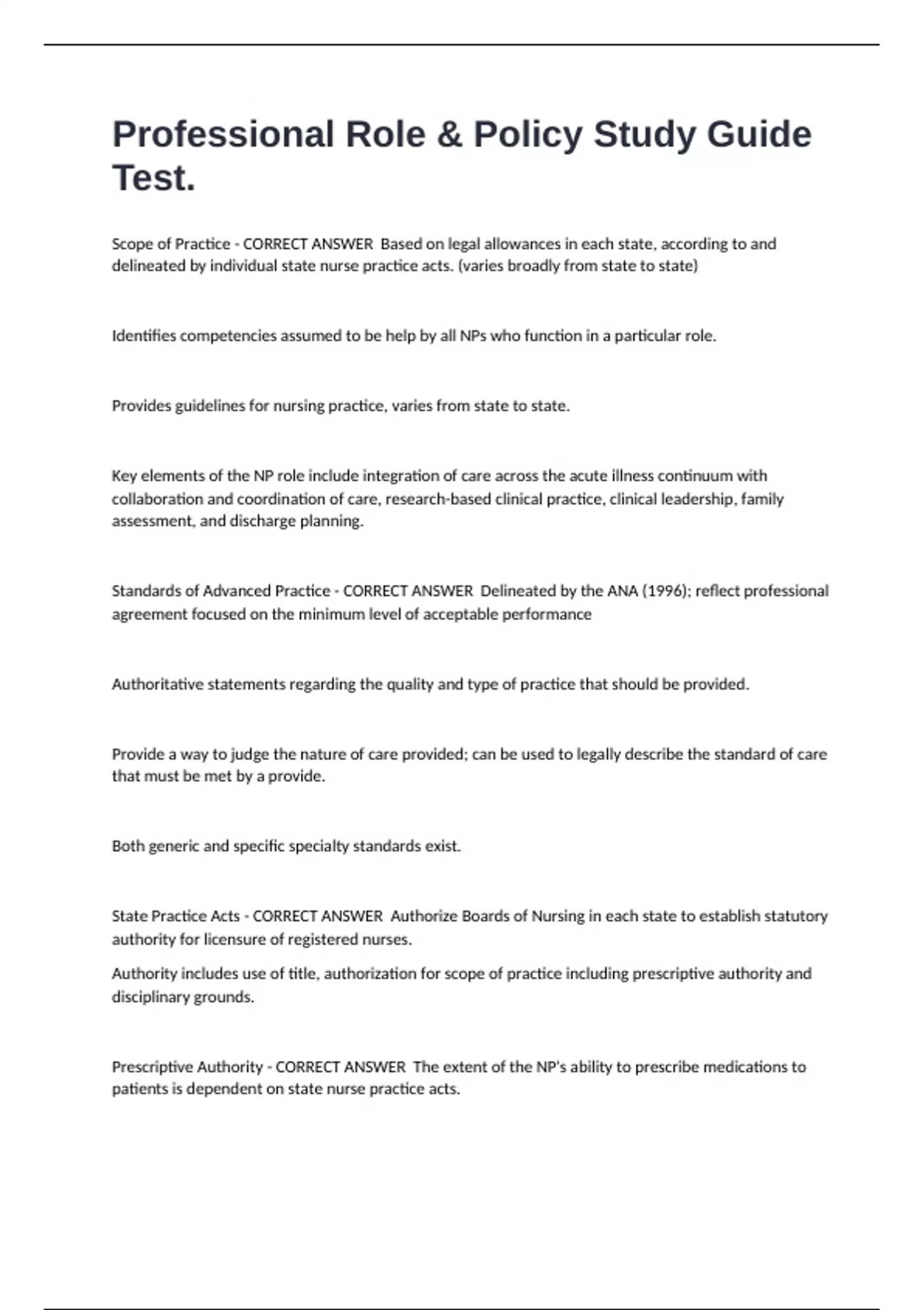 Professional Role & Policy Study Guide Test. Scope of Practice - CORRECT ANSWER Based on legal allowances in each state, according to and delineated by individual state nurse practice acts. (varies broadly from state to state) Identifies competencies assumed to be help by all NPs who function in a particular role. Provides guidelines for nursing practice, varies from state to state. Key elements of the NP role include integration of care across the acute illness continuum with collaboration and coordination of care, research-based clinical practice, clinical leadership, family assessment, and discharge planning. Standards of Advanced Practice - CORRECT ANSWER Delineated by the ANA (1996); reflect professional agreement focused on the minimum level of acceptable performance Authoritative statements regarding the quality and type of practice that should be provided. Provide a way to judge the nature of care provided; can be used to legally describe the standard of care that must be met by a provide. Both generic and specific specialty standards exist. State Practice Acts - CORRECT ANSWER Authorize Boards of Nursing in each state to establish statutory authority for licensure of registered nurses. Authority includes use of title, authorization for scope of practice including prescriptive authority and disciplinary grounds. Prescriptive Authority - CORRECT ANSWER The extent of the NP's ability to prescribe medications to patients is dependent on state nurse practice acts. While the Drug Enforcement Agency (DEA) has ruled that nurses in advanced practice may obtain registration numbers, state practice acts dictate the level of prescriptive authority allowed. Credentials - CORRECT ANSWER Encompass required education, licensure and certification to practice as a nurse practitioner. Establish minimal levels of acceptable performance. Credentialing is necessary to: (1) Ensure that safe heatlh care is provided by qualified individuals. (2) Comply with federal and state laws relating to advanced practice nursing. Acknowledges the scope of practice of the NP; mandates accountability; enforces professional standards for practice. Licensure - CORRECT ANSWER Establishes that a person is qualified to perform in a particular professional role. Licensure is granted as defined by rules and regulations set forth by a governmental regulatory body (i.e., state board of nursing). Certification - CORRECT ANSWER Establishes that a person has met certain standards in a particular profession which signify mastery of specialized knowledge and skills. Determines scope of practice (who you can or cannot see) Certification is granted by nongovernmental agencies such as the American Nurses Credentialing Center (ANCC), American Academy of Nurse Practitioners (AANP), Pediatric Nursing Certification Board (PNCB), and National Certification Corporation (NCC). Credentialing and Privileging - CORRECT ANSWER Process by which nurse practitioner is granted permission to practice in an inpatient setting. Credentialing with hospital privileges is granted by a Hospital Credentialing Committee comprised of physicians who hold privileges at the given hospital where the NP has made request. Privileges may be granted in part or full; stipulations regarding the allowance of future privileges may be made by the Credentialing Committee Utilitarianism - CORRECT ANSWER The right act is the one that produces the greatest good for the greatest number The role of the NP was developed in the early ______ as a result of ____________. - CORRECT ANSWER 1. 1960s 2. physician shortages in the area of pediatrics The first NP Program was a pediatric program, begun in: - CORRECT ANSWER 1964, by Dr. Loretta Ford and Dr. Henry Silver at the University of Colorado Health Sciences Center. After NP role was developed and first NP program began, growth of NP programs soon ensued with with distribution of NPs in various practice settings with an emphasis on: - CORRECT ANSWER Ambulatory and outpatient care.