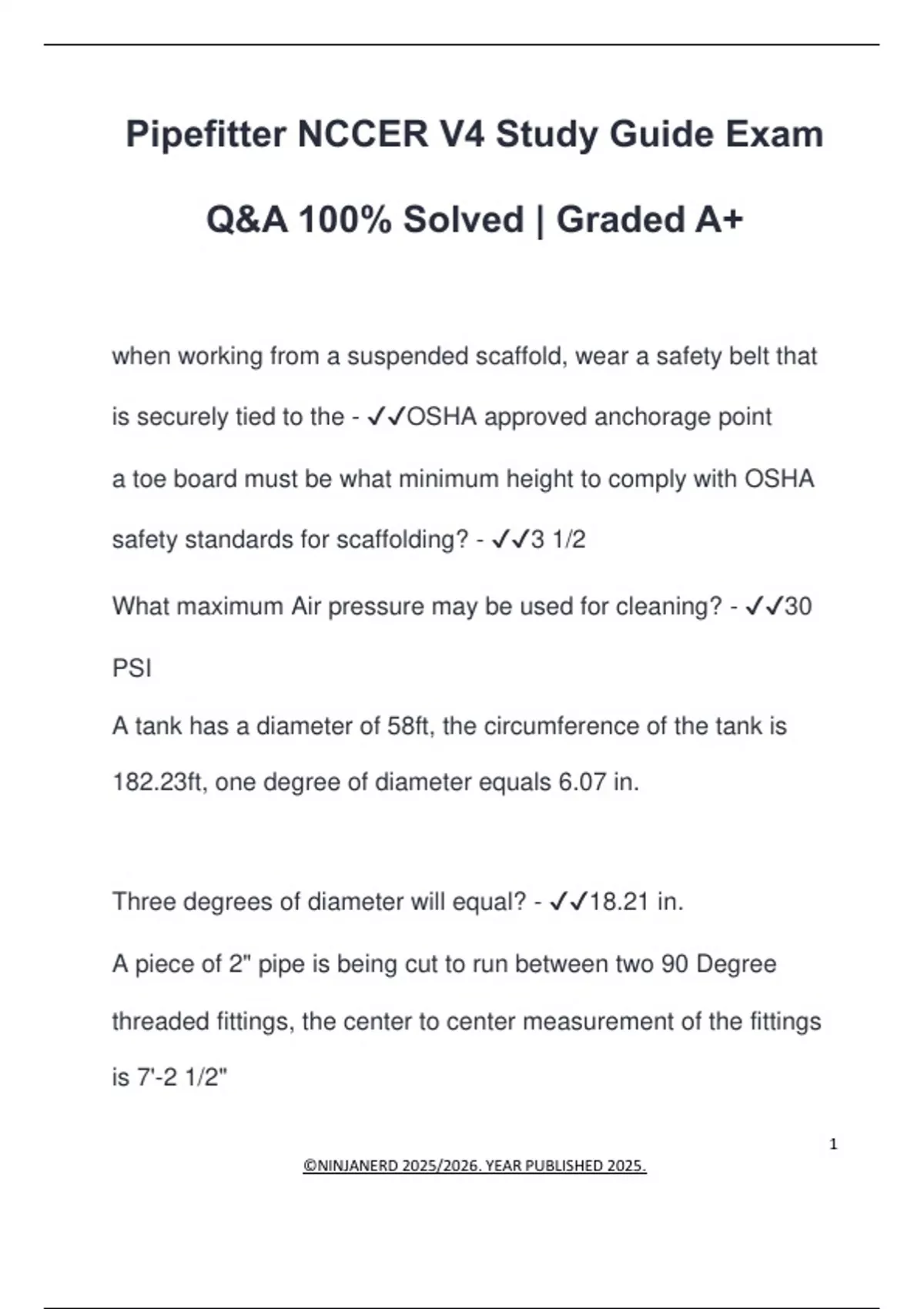 Pipefitter NCCER V4 Study Guide Exam Q&A 100% Solved | Graded A+ when working from a suspended scaffold, wear a safety belt that is securely tied to the - OSHA approved anchorage point a toe board must be what minimum height to comply with OSHA safety standards for scaffolding? - 3 1/2 What maximum Air pressure may be used for cleaning? - 30 PSI A tank has a diameter of 58ft, the circumference of the tank is 182.23ft, one degree of diameter equals 6.07 in. Three degrees of diameter will equal? - 18.21 in. A piece of 2" pipe is being cut to run between two 90 Degree threaded fittings, the center to center measurement of the fittings is 7'-2 1/2"