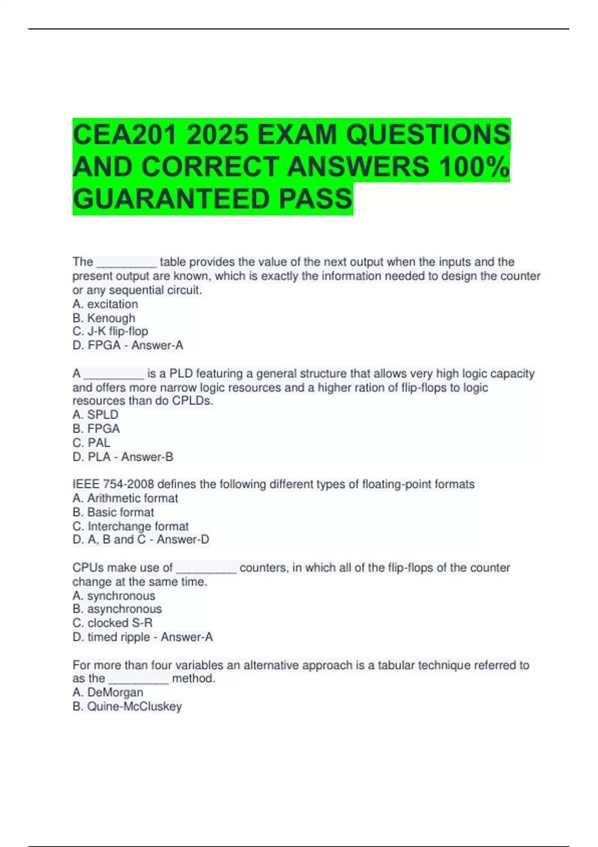 CEA201 2025 EXAM QUESTIONS AND CORRECT ANSWERS 100% GUARANTEED PASS The _________ table provides the value of the next output when the inputs and the present output are known, which is exactly the information needed to design the counter or any sequential circuit. A. excitation B. Kenough C. J-K flip-flop D. FPGA - Answer-A A _________ is a PLD featuring a general structure that allows very high logic capacity and offers more narrow logic resources and a higher ration of flip-flops to logic resources than do CPLDs. A. SPLD B. FPGA C. PAL D. PLA - Answer-B IEEE 754-2008 defines the following different types of floating-point formats A. Arithmetic format B. Basic format C. Interchange format D. A, B and C - Answer-D CPUs make use of _________ counters, in which all of the flip-flops of the counter change at the same time. A. synchronous B. asynchronous C. clocked S-R D. timed ripple - Answer-A For more than four variables an alternative approach is a tabular technique referred to as the _________ method. A. DeMorgan B. Quine-McCluskey C. Karnaugh map D. Boole-Shannon - Answer-B Which of the following is a functionally complete set? A. AND, NOT B. NOR C. AND, OR, NOT D. all of the above - Answer-D A _______ is an electronic circuit that produces an output signal that is a simple Boolean operation on its input signals. A. gate B. decode rC. counter D. flip-flop - Answer-A How many ways can floating-point number be expressed? A. One B. Two C. Five D. Many ways - Answer-D In division of Unsigned Binary Integers, the result of / 1010 is: Q = Quotient, R = Remainder: A. Q = , R = 100 B. Q = , R = 1000 C. Q = , R = 1000 D. Q = , R = 100 - Answer-C The unary operation _________ inverts the value of its operand. A. OR B. NOT C. NAND D. XOR - Answer-B ________ are used in digital circuits to control signal and data routing. A. Multiplexers B. Program counters C. Flip-flops D. Gates - Answer-A The ________ specifies the operation to be performed. a. source operand reference b. opcode c. next instruction reference d. processor register - Answer-B A(n) _________ expresses operations in a concise algebraic form using variables. a. opcode b. high-level language c. machine language d. register - Answer-B _______ instructions operate on the bits of a word as bits rather than as numbers, providing capabilities for processing any other type of data the user may wish to employ. a. Logic b. Arithmetic c. Memory d. Test - Answer-A What is the comment of the instruction SUB Y,A,B a. Y<-A-B b. Y-A-B c. Y<-A<-B d. Y->A->b - Answer-B The x86 data type that is a signed binary value contained in a byte, word, or doubleword, using twos complement representation is _________. a. general b. ordinal c. integer d. packed BCD - Answer-C Which of the following is a true statement? a. a procedure can be called from more than one location b. a procedure call can appear in a procedure c. each procedure call is matched by a return in the called program d. all of the above - Answer-D The entire set of parameters, including return address, which is stored for a procedure invocation is referred to as a _________. a. branch b. stack frame c. popd. push - Answer-B Which ARM operation category includes logical instructions (AND, OR, XOR), add and subtract instructions, and test and compare instructions? a. data-processing instructions b. branch instructions c. load and store instructions d. extend instructions - Answer-A In the ARM architecture only _________ instructions access memory locations. a. data processing b. status register access c. load and store d. branch - Answer-C Which data type is defined in MMX? a. packed byte b. packed word c. packed doubleword d. all of the above - Answer-D A branch instruction in which the branch is always taken is _________. a. conditional branch b. unconditional branch c. jump d. bi-endian - Answer-B The most fundamental type of machine instruction is the _________ instruction. a. conversion b. data transfer c. arithmetic d. logical - Answer-b ______ instructions are needed to transfer programs and data into memory and the results of computations back out to the user. a. I/O b. Transfer c. Control d. Branch - Answer-A ______ instructions are needed to transfer programs and data into memory and the results of computations back out to the user. a. I/O b. Transfer c. Control d. Branch - Answer-A A(n) _________ expresses operations in a concise algebraic form using variables.There must be ________ instructions for moving data between memory and the registers .a. branch b. logic c. memory d. I/O - Answer-C