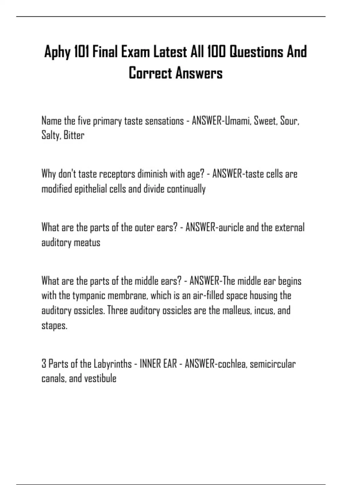 Aphy 101 Final Exam Latest Updated 2025 All 100 Questions And Correct Answers Name the five primary taste sensations - ANSWER-Umami, Sweet, Sour, Salty, Bitter Why don't taste receptors diminish with age? - ANSWER-taste cells are modified epithelial cells and divide continually What are the parts of the outer ears? - ANSWER-auricle and the external auditory meatus What are the parts of the middle ears? - ANSWER-The middle ear begins with the tympanic membrane, which is an air-filled space housing the auditory ossicles. Three auditory ossicles are the malleus, incus, and stapes. 3 Parts of the Labyrinths - INNER EAR - ANSWER-cochlea, semicircular canals, and vestibule How are sound vibrations transmitted to the inner ear? - ANSWER-The tympanic membrane vibrates the malleus, which vibrates the incus, then the stapes. The stapes vibrates the fluid inside the oval window of the inner ear. What is static equilibrium? - ANSWER-help to maintain the position of the head when the head and body are still the organs of static equilibrium are located within the bony vestibule of the inner ear, inside the utricle and saccule (expansions of the membranous labyrinth). A macula, consisting of hair cells and supporting cells, lies inside the utricle and saccule What is dynamic equilibrium? - ANSWER-help to maintain balance when the head and body suddenly move and rotate