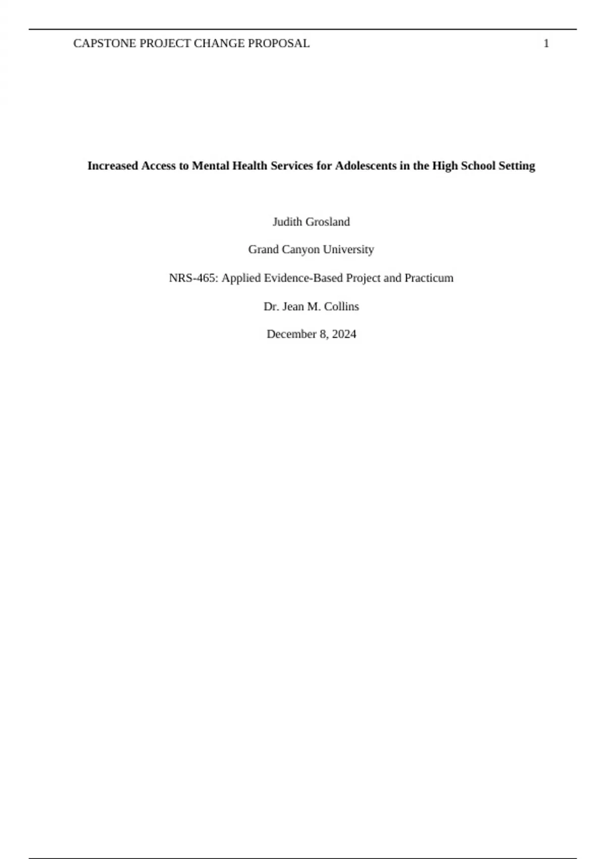NRS-465 RS-T8-Capstone Project Change Proposal Answered. Increased Access to Mental Health Services for Adolescents in the High School Setting