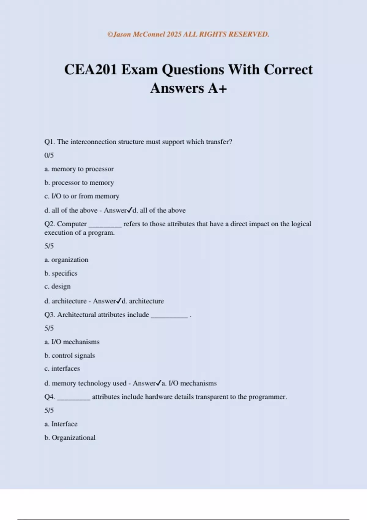 CEA201 Exam Questions With Correct Answers A+ Q1. The interconnection structure must support which transfer? 0/5 a. memory to processor b. processor to memory c. I/O to or from memory d. all of the above - Answerd. all of the above Q2. Computer _________ refers to those attributes that have a direct impact on the logical execution of a program. 5/5 a. organization b. specifics c. design d. architecture - Answerd. architecture Q3. Architectural attributes include __________ . 5/5 a. I/O mechanisms b. control signals c. interfaces d. memory technology used - Answera. I/O mechanisms Q4. _________ attributes include hardware details transparent to the programmer. 5/5 a. Interface b. Organizational ©Jason McConnel 2025 ALL RIGHTS RESERVED. c. Memory d. Architectural - Answerb. Organizational Q5. It is a(n) _________ design issue whether a computer will have a multiply instruction. 5/5 a. architectural b. memory c. elementary d. organizational - Answera. architectural Q6. An I/O device is referred to as a __________. 5/5 a. CPU b. control device c. peripheral d. register - Answerc. peripheral Q7. The _________ stores data 5/5 a. system bus b. I/O c. main memory d. control unit - Answerc. main memory Q8. The __________ moves data between the computer and its external environment. 5/5 a. data transport b. I/O c. register d. CPU interconnection - Answerb. I/O Q9. A common example of system interconnection is by means of a __________. 5/5 a. register ©Jason McConnel 2025 ALL RIGHTS RESERVED. b. system bus c. data transport d. control device - Answerb. system bus Q10._________ provide storage internal to the CPU. 5/5 a. Control units b. ALUs c. Main memory d. Registers - Answerd. Registers Q11. The __________ performs the computer's data processing functions. 5/5 a. Register b. CPU interconnection c. ALU d. system bus - Answerc. ALU Q12. Virtually all contemporary computer designs are based on concepts developed by __________ at the Institute for Advanced Studies, Princeton. 5/5 a. John Maulchy b. John von Neumann c. Herman Hollerith d. John Eckert - Answerb. John von Neumann Q13. The processing required for a single instruction is called a(n) __________ cycle. 0/5 a. execute b. fetch c. instruction d. packet - Answerc. instruction Q14. The von Neumann architecture is based on which concept?