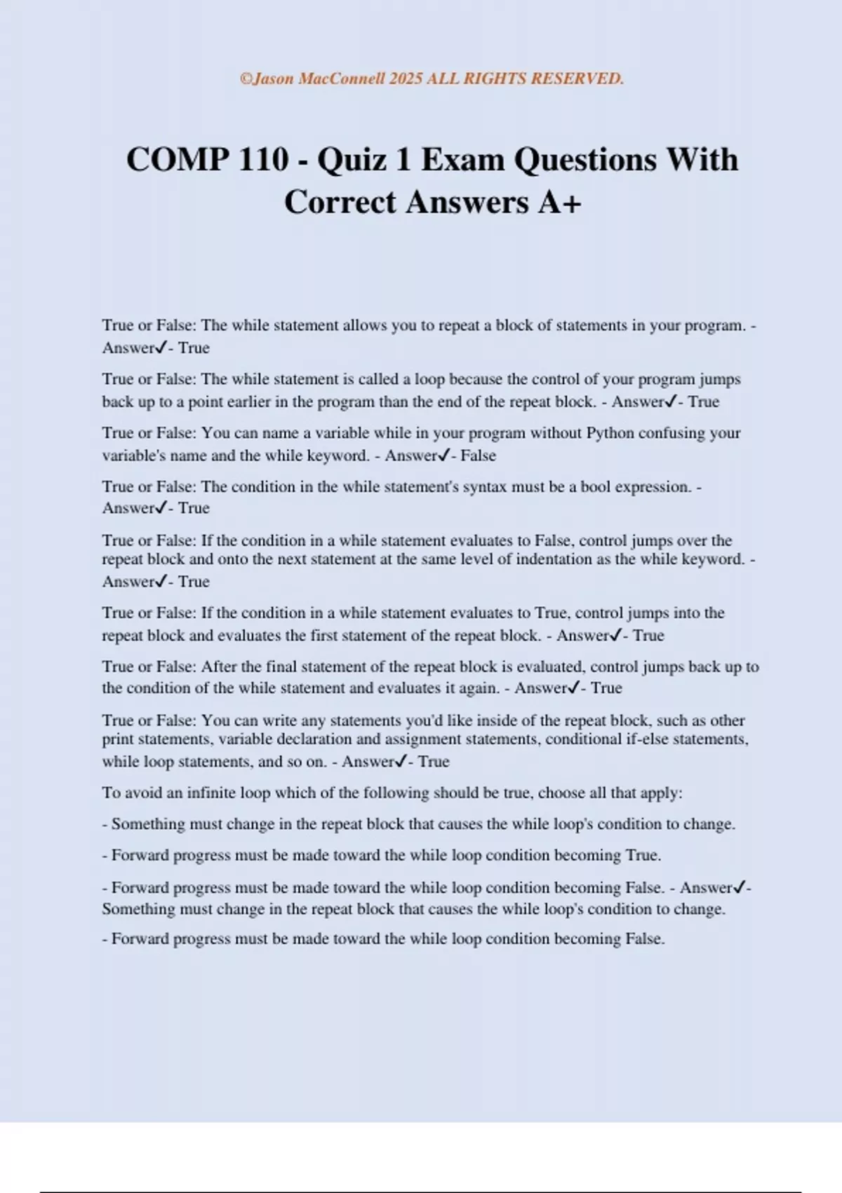 COMP 110 - Quiz 1 Exam Questions With Correct Answers A+ True or False: The while statement allows you to repeat a block of statements in your program. - Answer- True True or False: The while statement is called a loop because the control of your program jumps back up to a point earlier in the program than the end of the repeat block. - Answer- True True or False: You can name a variable while in your program without Python confusing your variable's name and the while keyword. - Answer- False True or False: The condition in the while statement's syntax must be a bool expression. - Answer- True True or False: If the condition in a while statement evaluates to False, control jumps over the repeat block and onto the next statement at the same level of indentation as the while keyword. - Answer- True True or False: If the condition in a while statement evaluates to True, control jumps into the repeat block and evaluates the first statement of the repeat block. - Answer- True True or False: After the final statement of the repeat block is evaluated, control jumps back up to the condition of the while statement and evaluates it again. - Answer- True True or False: You can write any statements you'd like inside of the repeat block, such as other print statements, variable declaration and assignment statements, conditional if-else statements, while loop statements, and so on. - Answer- True To avoid an infinite loop which of the following should be true, choose all that apply: - Something must change in the repeat block that causes the while loop's condition to change. - Forward progress must be made toward the while loop condition becoming True. - Forward progress must be made toward the while loop condition becoming False. - Answer- Something must change in the repeat block that causes the while loop's condition to change. - Forward progress must be made toward the while loop condition becoming False. ©Jason MacConnell 2025 ALL RIGHTS RESERVED. True or False: Your computer knows when you write an infinite loop in your program and will not run your program if it sees it is doing pointless, endless work on your behalf. - Answer- False True or False: An iteration of a loop is one evaluation of the repeat block and it should be making incremental progress toward the goal of the loop. - Answer- True True or False: The number of iterations a loop runs for is the number of times the repeat block is evaluated. - Answer- True True or False: The then block of an if statement and the repeat block of a while statement are semantically the same, including what happens after each block completes. - Answer- False True or False: The phrase "if loop" is incorrect and should not be said. The phrase "while loop" is correct. - Answer- True True or False: You can use a while loop to iterate through each item in a collection. For example, a str is a collection of characters, and you can use a while loop to iterate through each character one-by-one. - Answer- True True or False: The variable i is commonly used as a counter variable when writing while loops. You can choose other variable names instead, though. For example, counter could have been used as the variable name instead. - Answer- True True or False: When iterating through a collection using the index/subscription operator, such as with a string, it is common to use your counter variable as the index operator's int value in order to access individual items in the collection one-by-one. - Answer- True True or False: The big, valuable idea of a loop is that it allows you to write a fixed number of lines of code that can process arbitrarily sized amounts of data and/or computations. - Answer- True What is the result of the following boolean expression? not True - True - False - Answer- False What is the result of the following boolean e