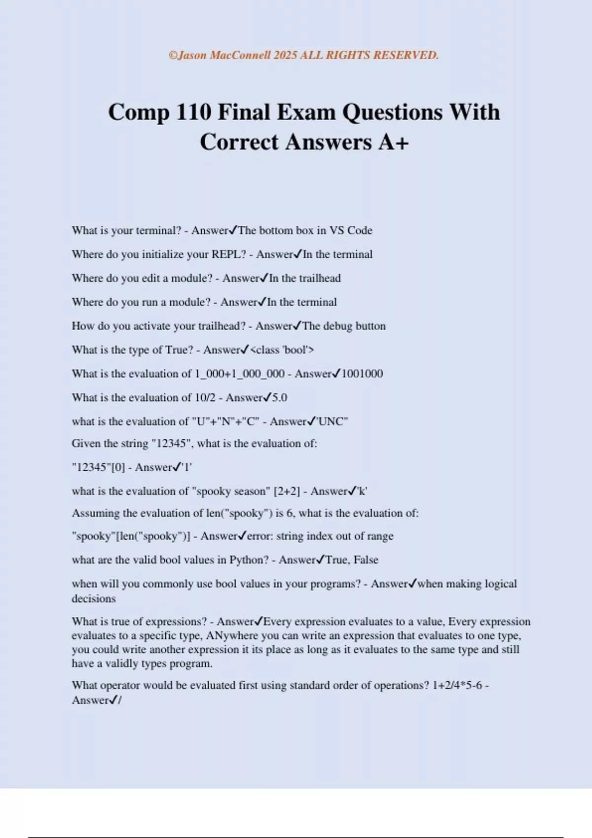Comp 110 Final Exam Questions With Correct Answers A+ What is your terminal? - AnswerThe bottom box in VS Code Where do you initialize your REPL? - AnswerIn the terminal Where do you edit a module? - AnswerIn the trailhead Where do you run a module? - AnswerIn the terminal How do you activate your trailhead? - AnswerThe debug button What is the type of True? - Answer<class 'bool'> What is the evaluation of 1_000+1_000_000 - Answer1001000 What is the evaluation of 10/2 - Answer5.0 what is the evaluation of "U"+"N"+"C" - Answer'UNC" Given the string "12345", what is the evaluation of: "12345"[0] - Answer'1' what is the evaluation of "spooky season" [2+2] - Answer'k' Assuming the evaluation of len("spooky") is 6, what is the evaluation of: "spooky"[len("spooky")] - Answererror: string index out of range what are the valid bool values in Python? - AnswerTrue, False when will you commonly use bool values in your programs? - Answerwhen making logical decisions What is true of expressions? - AnswerEvery expression evaluates to a value, Every expression evaluates to a specific type, ANywhere you can write an expression that evaluates to one type, you could write another expression it its place as long as it evaluates to the same type and still have a validly types program. What operator would be evaluated first using standard order of operations? 1+2/4*5-6 - Answer/ ©Jason MacConnell 2025 ALL RIGHTS RESERVED. which operator is used to raise one number to the power of another - Answer** which operator is used to find the remainder of an integer division calculation and results in an int types value? - Answer% which of the following boolean expressions results in a value of False? - Answer1>1, 1>2, 1>=2 comparing two string values using relational operators always works the way you would expect it to in the English Language - AnswerFalse Which relational operator tests whether two values are equal to one another? - Answer== The random package has many functions for generating random numbers. There's a random function defined in the random package, you can import and call using a function call expression like so: >>> from random import random >>> random() Try calling the random function many times. What type does a call to the random function evaluate to? - Answer<class 'float'> The random package also has many functions for random selections. There's a choice function defined in the random package, you can import and call using a function call expression with a sequence as an argument, like so: >>> from random import choice >>> choice("wxyz") Try calling the choice function many times and with different str values as input arguments. What type does a call to the choice function evaluate to in these examples? - Answer<class 'str'> The str class defines a method named isalpha for testing whether a string is made entirely of alphabetical characters. It also has a method named isdigit Given the three following expressions, what is the order of their evaluations? >>> "comp110".isalpha() >>> "110".isdigit() >>> "comp110"[0].isalpha() - AnswerFalse, True, True Functions are used for: - Answer- Process abstraction - Breaking larger programs into smaller sub-programs T/F: Function calls are expressions that evaluate to a specific data type. - AnswerTrue T/F: Defining a function is the same as calling it - AnswerFalse T/F: A function definition can be thought of as a specification of the instructions which will be carried out when the function is called - AnswerTrue