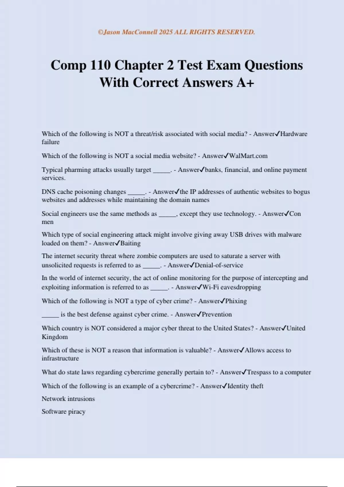 Comp 110 Chapter 2 Test Exam Questions With Correct Answers A+ Which of the following is NOT a threat/risk associated with social media? - AnswerHardware failure Which of the following is NOT a social media website? - AnswerWalM Typical pharming attacks usually target _____. - Answerbanks, financial, and online payment services. DNS cache poisoning changes _____. - Answerthe IP addresses of authentic websites to bogus websites and addresses while maintaining the domain names Social engineers use the same methods as _____, except they use technology. - AnswerCon men Which type of social engineering attack might invol