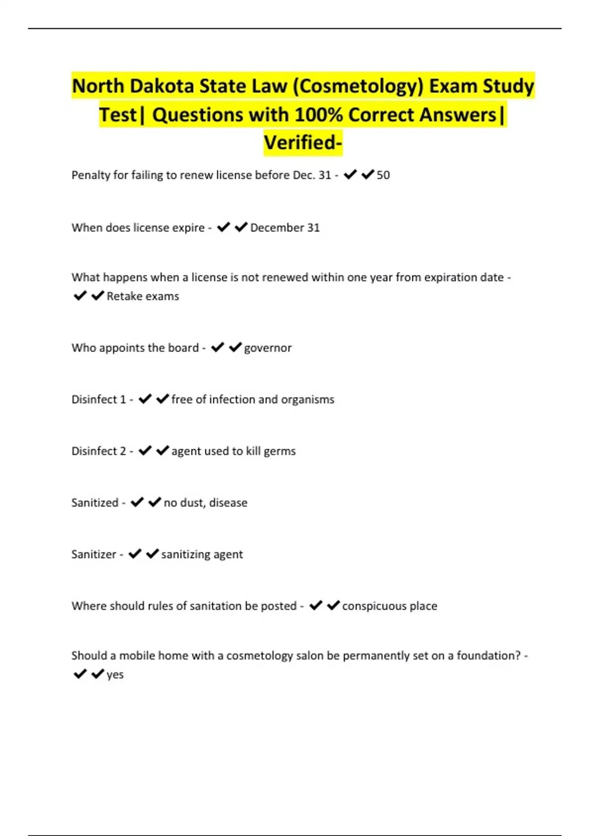 North Dakota State Law (Cosmetology) Exam Study Test| Questions with 100% Correct Answers| Verified